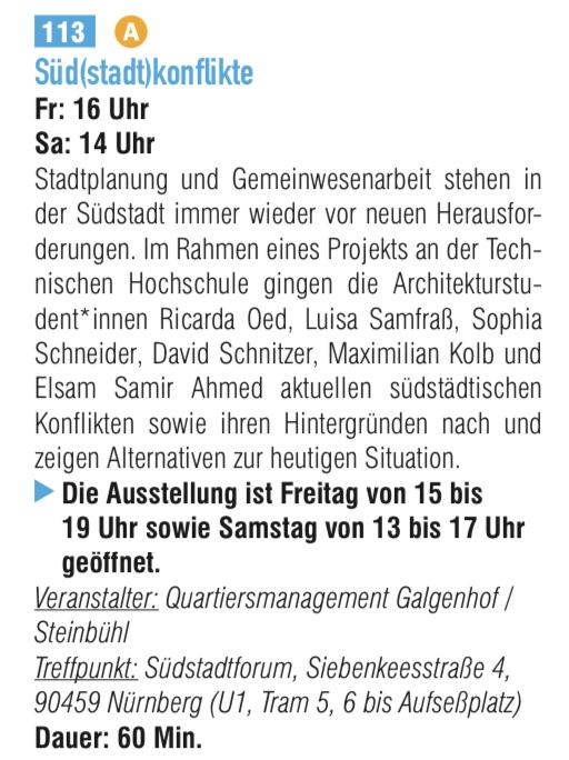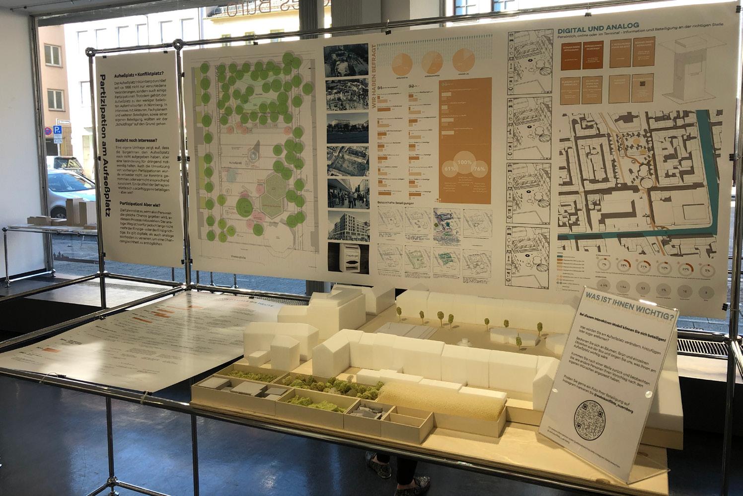 Ausstellund und Führungen zum Projekt, als Teil der jährlichen Stadt(ver)führungen der Stadt Nürnberg. Die Ausstellung fand im Südstaftforum statt, in welchem Besucher*innen sich erneut beteiligen konnten und Veränderungen im Modell durchführen konnten. Zusätzlich wurden Führungen und Vorträge angeboten, in welchem die Situation des Platzes vor Ort analysiert, beschrieben und diskutiert wurde.