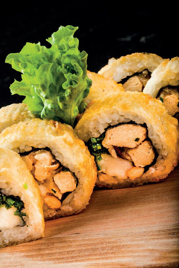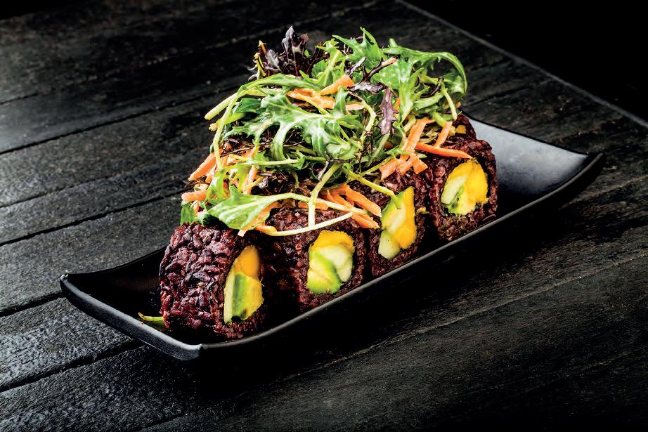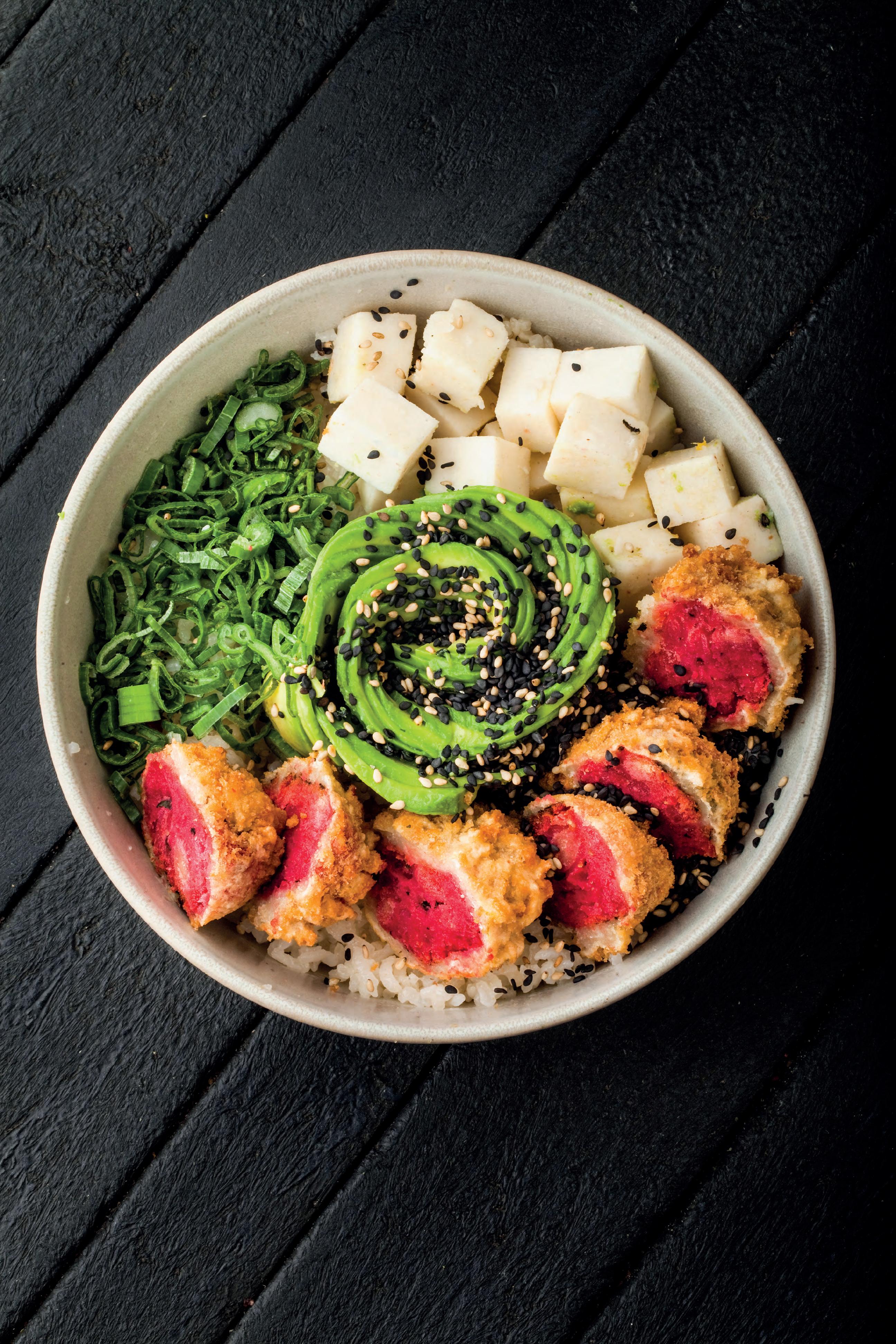 Animal Lover. Arroz blanco, VGN cream cheese, palta, camote furay acompañado de ceviche de porotos negros
