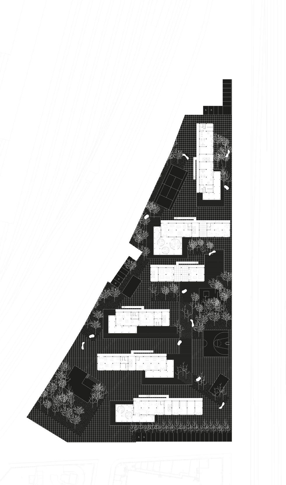 What can be the result of transposing perhaps the less successful soviet residential model into an airport city? From super(block) to mini: from a permanent way of living to a temporary one, from complete isolation to a certain degree of public life. The block components: a socle and some buildings, the first an enclosed village of patio typology housing, the last a collection of different housing models standing upon it. The exception: two digging curves recycle the patio typology to create an ambiguous indoor/outdoor collective experience.
