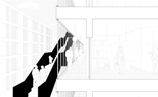 The area was organized by arranging the space rhytmically with six buildings. Those buildings, are placed in relation to the alignment to the railway perpendicularly and one longitudinally in the most extended area to the north-east. Those constructions, which represent the same skin but vary according to length and height, reaching a maximum of seven floors, are organized by five different typologies of short-term accommodations, according to the time of staying and the necessities of different people. The success of the near Toolbox coworking suggests also to look at the needs of youth culture in terms of public and shared spaces.