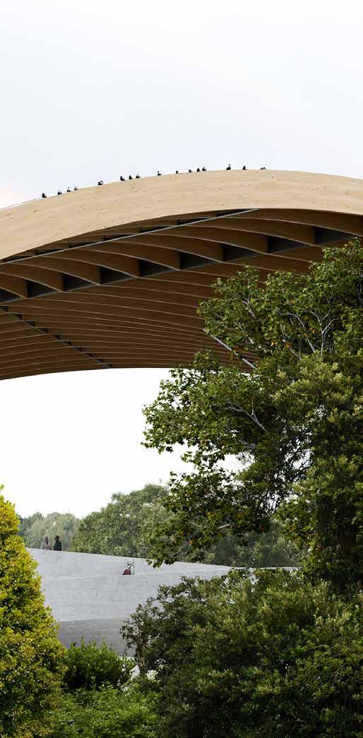 The use of mass timber not only offers significant aesthetic appeal but also acoustic performance, weather resilience and fire safety. The timber acts as a carbon sink and allows the project to achieve a 40 per cent reduction in embodied carbon compared to the baseline. The amphitheatre has already received numerous awards for its innovative, sustainable mass-timber design.