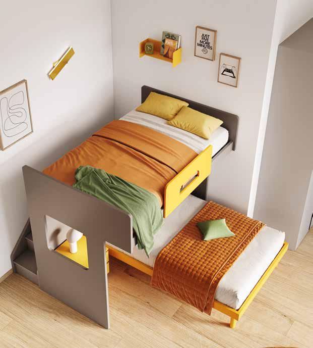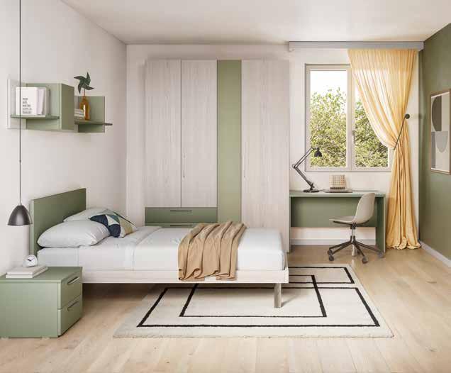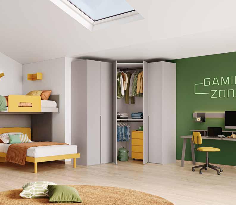 Armadio componibile L 215/185 P 59 H 260 cm, in finitura canapa. / 81,71 € AL MESE • Letto a castello a una piazza e mezza con scaletta posteriore L 206 P 234 H 176 cm. 3.046 € DOPPIO SCONTO IVA 2.041 € RISPARMI 1.005 € / 87,59 € AL MESE • Letto a una piazza e mezza L 129 P 209 H 90 cm. 555 € DOPPIO SCONTO IVA 372 € RISPARMI 183 € • Scrittoio da gamer L 150 P 65 H 85 cm. 970 € DOPPIO SCONTO IVA 650 € RISPARMI 320 € Collezione disponibile in 27 colori.