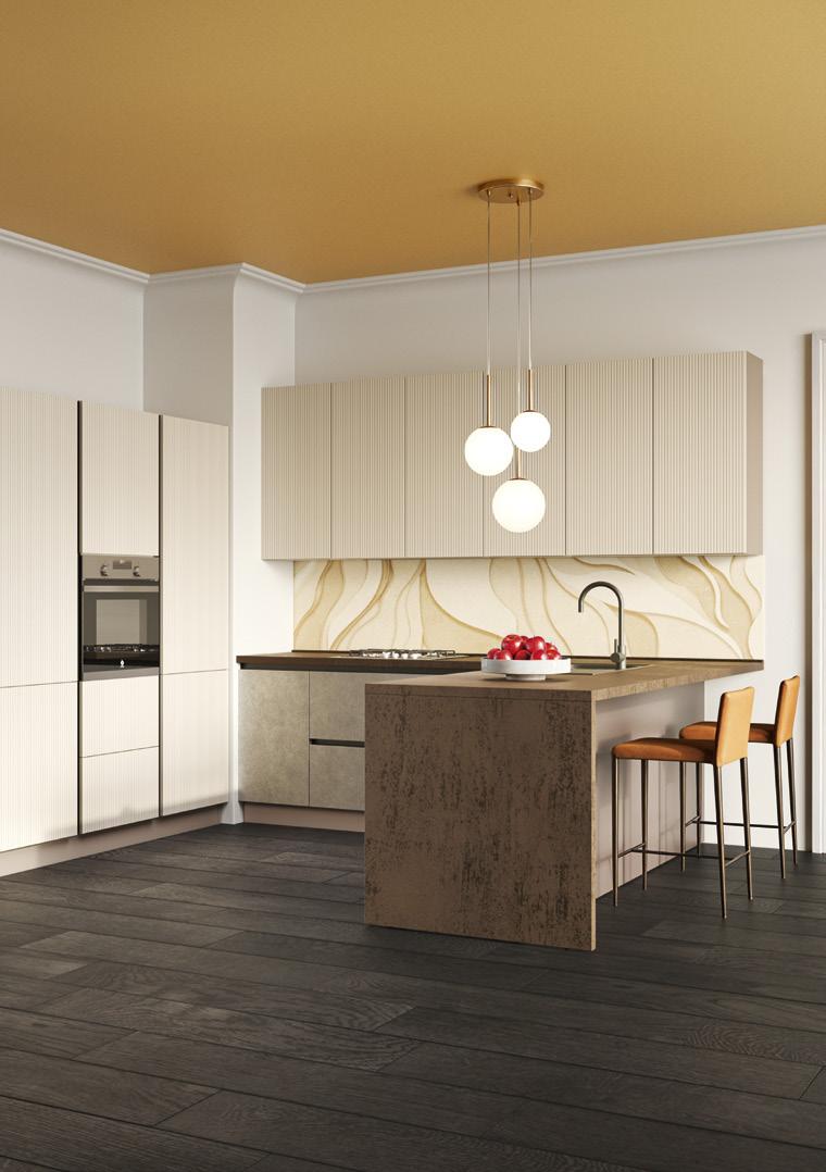 Cucina componibile finitura bronzo e cannettato sabbia. Disponibile in 12 colori.