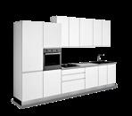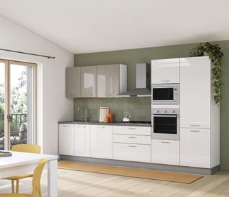 3. Cucina L 360 P 32/60 H 216 cm. Completa di elettrodomestici: frigo, forno, microonde, piano cottura, lavastoviglie, cappa e lavello. In finitura lucida bianco e tortora. Disponibile in 13 colori.