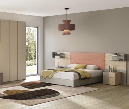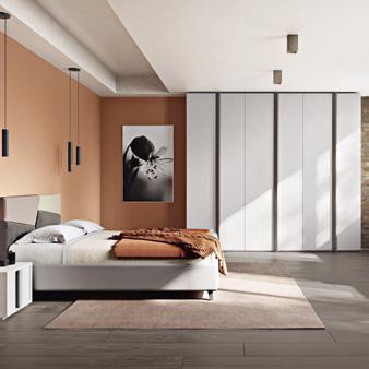4. Camera matrimoniale completa composta da: armadio L 275 P 60 H 252 cm, comò, due comodini, letto matrimoniale con contenitore e luce led sulla testiera. In finitura roccia e legno miele. Disponibile in 9 colori.