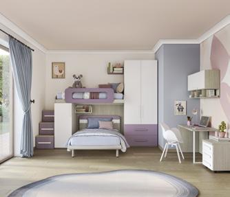 4. Cameretta a soppalco L 350 P 199 H 259 cm con letto singolo e letto a una piazza e mezza. In finitura legno cenere, bianco e quarzo. Disponibile in 27 colori.