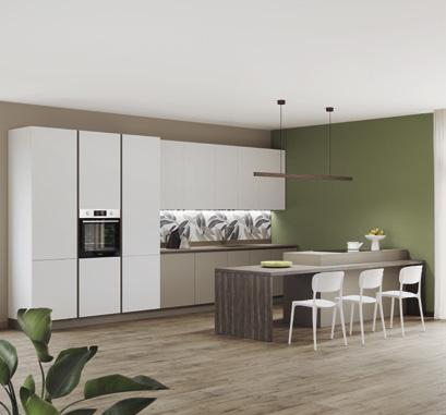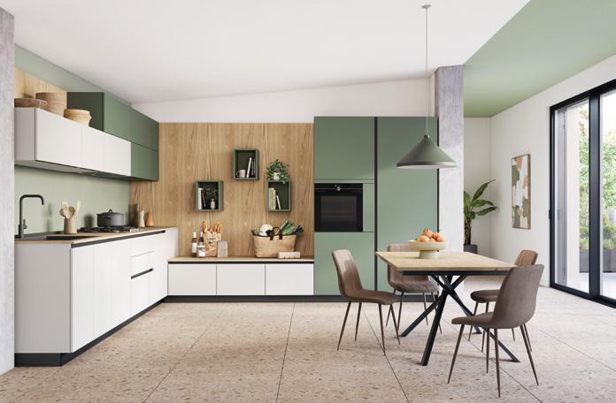 Cucina componibile in finitura verde oliva, rovere Nuova Zelanda e Ostuni chiaro. Disponibile in 31 colori.