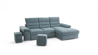 Divano letto L 263 P 170/105 H 79/100 cm con penisola contenitore, poggiatesta regolabili e due pouf. In tessuto blu. Disponibile in 186 colori.