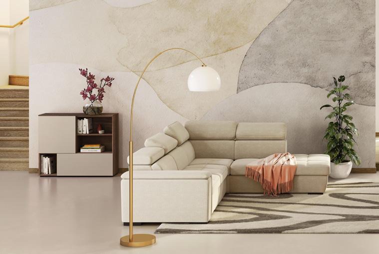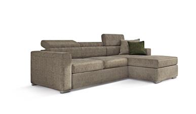1. Divano letto L 252 P 98/166 H 95 cm con penisola contenitore e poggiatesta recliner. In tessuto nocciola. Disponibile in 30 colori.