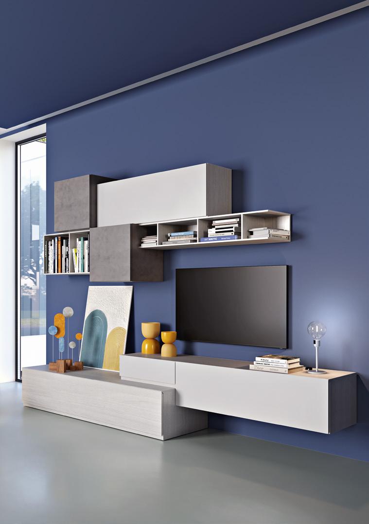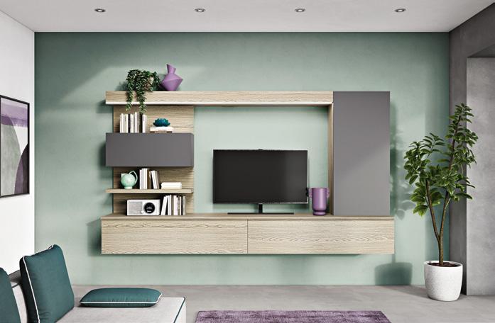 Soggiorno componibile L 297 P 58 H 210 cm in finitura nuvola frassinato, tele e stone grey. Disponibile in 33 colori.