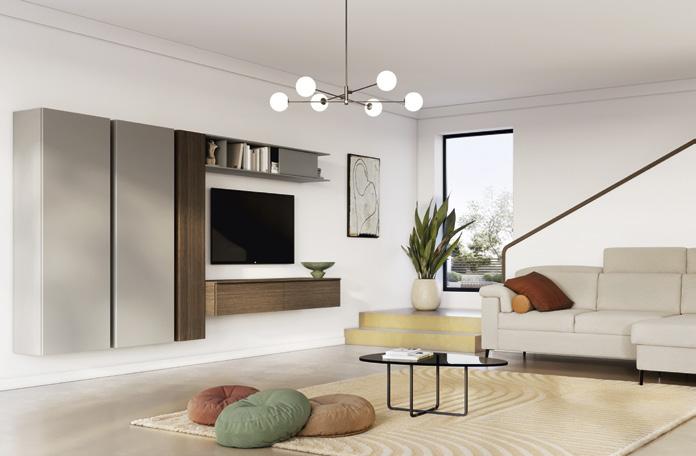 2. Soggiorno L 270 P 48 H 195 cm, in finitura noce, bianco seta, visone e grigio fango.