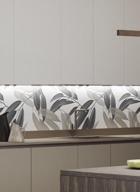 Cucina componibile in finitura bianco e grigio terra. Disponibile in 23 colori. Lo schienale è in metallo con stampa decorativa. Sono disponibili diversi decori per personalizzare la tua cucina.