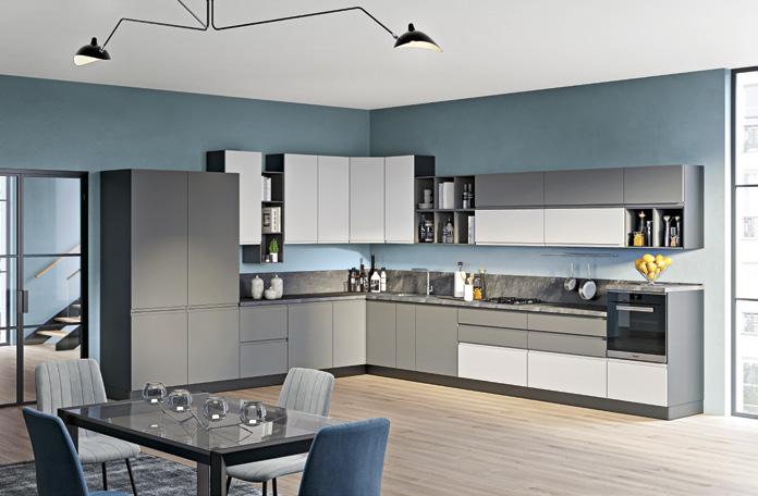 Cucina componibile in finitura opaca grigio antracite e grigio acciaio. Disponibile in 10 colori.