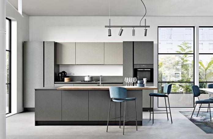 Cucina componibile con ante in gres e vetro in finitura tortora, grigio Londra e ossido. Disponibile in 45 colori.