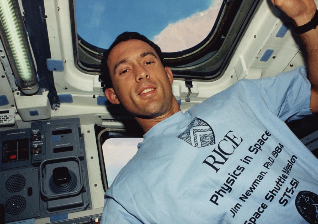 Astronaut Jim Newman ’84, one of 16 Rice faculty and alumni to serve as an astronaut or NASA administrator, pictured aboard the space shuttle Discovery in 1993