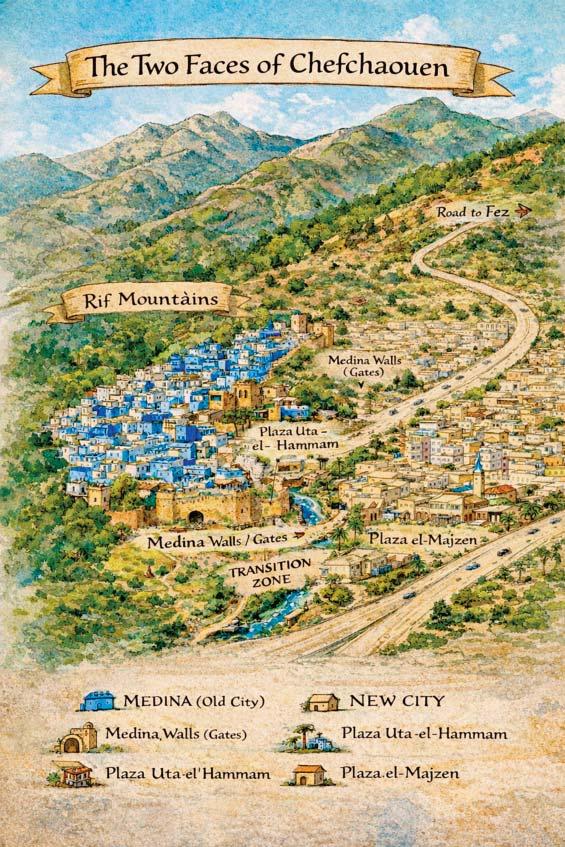 With help from ChatGPT (OpenAI), through a process of prompting back and forth, I created a simple illustrated map to help show how Chefchaouen presents itself to an outsider. One moment you are brushing up against history; the next, you are standing in modern Morocco, traffic humming softly nearby.