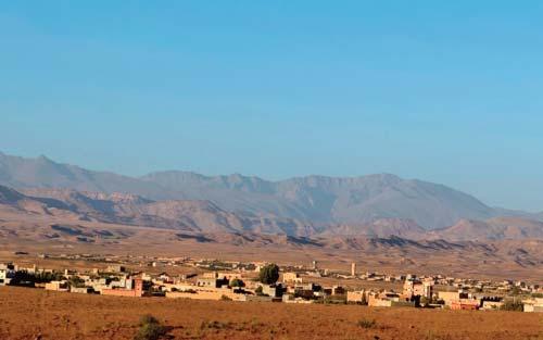 South of Toufliht looking at two different mountain systems, with a broad valley basin between them. The near, darker, greener mountains are the High Atlas Mountains. The far, pale blue silhouettes on the horizon are the Anti-Atlas Mountains and the wide flat zone between them is the Ouarzazate Basin.