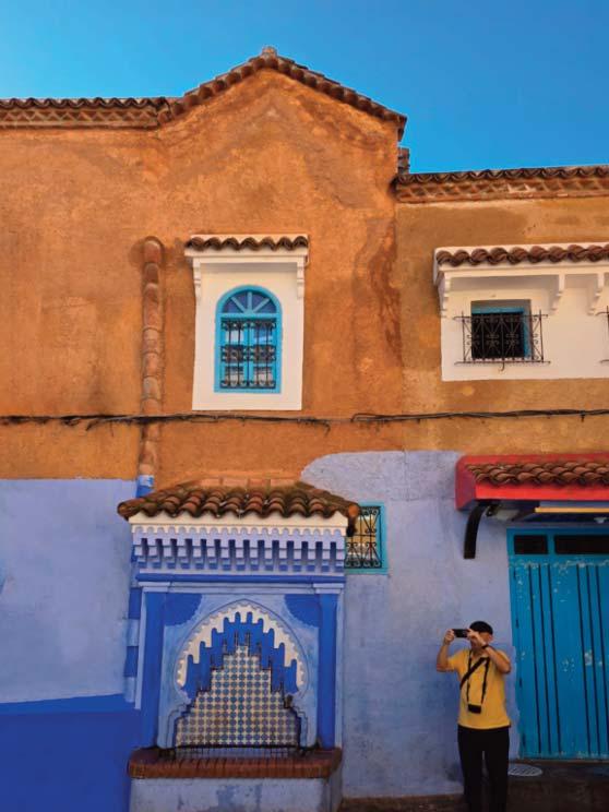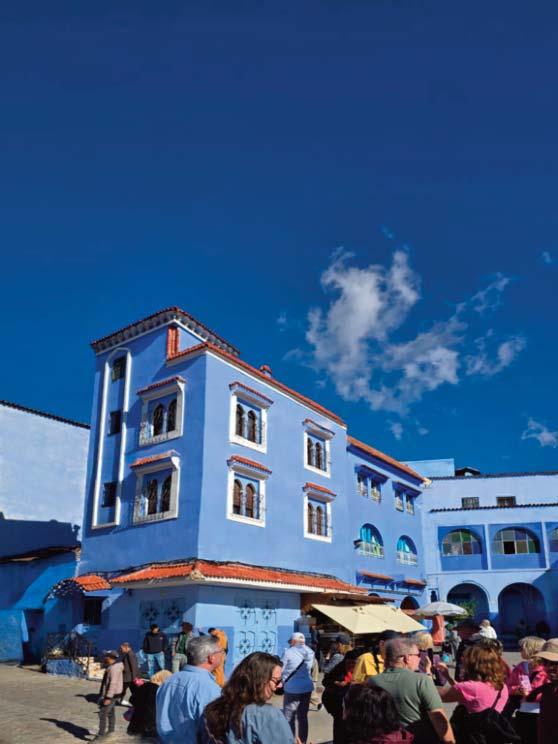 Stepping off the bus after days of dust, gravel, and earth tones, the blue feels like a physical sensation. A cooling. A slowing. As if the city has learned how to receive the weary. The Rif Mountains, which had jostled us for hours, release their grip here, and the body responds instinctively. Shoulders drop. Breathing deepens. The pace changes without instruction.