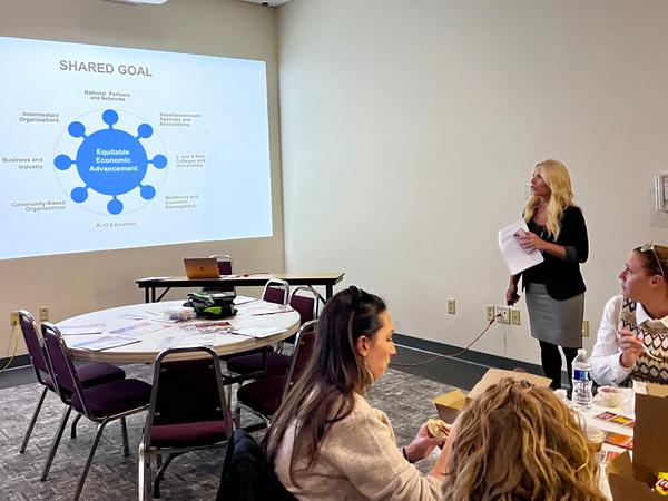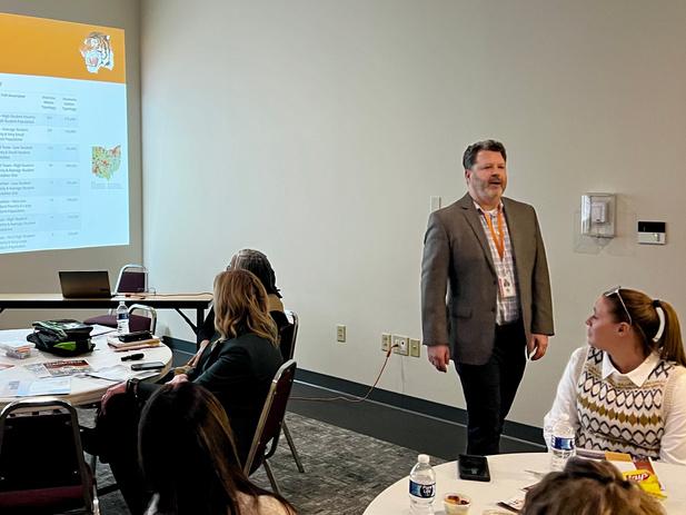 From let, Major Mary F Kauffman from the 179th Cyberspace Wing discussed educational training related to the conversion. Amy Wood, Director of Grants and Special Projects, highlighted how Mid-Ohio Educational Service Center supports partner districts and the graduation seals students earn Mansfield City School personnel shared their strategic goals and core commitments. The class learned about Madison student and adult education programs and toured labs