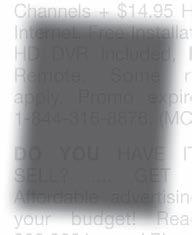 FREE HIGH speed internet for those that qualify. Government program for recipients of select programs incl. Medicaid, SNAP, Housing Assistance, WIC, Veterans Pension, Survivor Bene ts, Lifeline, Tribal. 15 GB internet service. Bonus offer: Android tablet FREE with onetime $20 copay. Free shipping & Handling. Call Maxsip Telecom today! 1-855-454-6827 (WCAN) GET DIRECTV for $84.99/mo for 24 months with CHOICE Package. New 2 year price guarantee. First 3 months of HBO Max, Cinemax, Showtime, Starz & Epix included! Directv is #1 in Customer Satisfaction (JD Power & Assoc.) Some restrictions apply Call 1-888-925-9452 (WCAN)