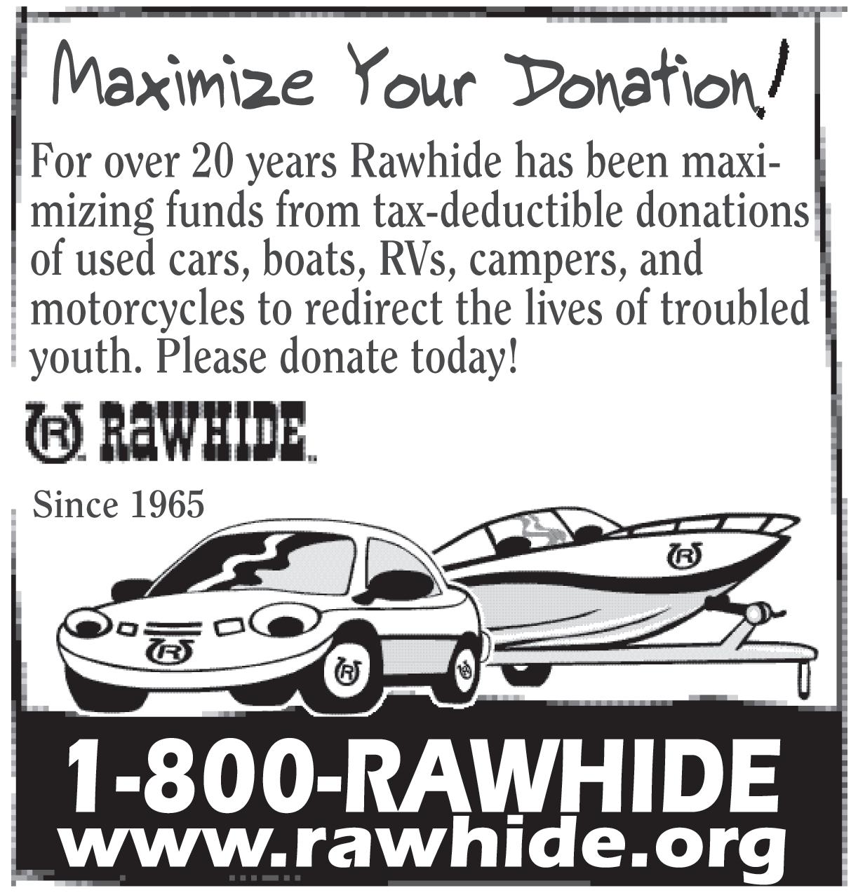 YOUR CAR, BOAT OR MOTORCYCLE helps Rawhide provide mental health services that redirect local Wisconsin youth & adults from harmful decisions. Donate Today! 888-6532729 (WCAN).