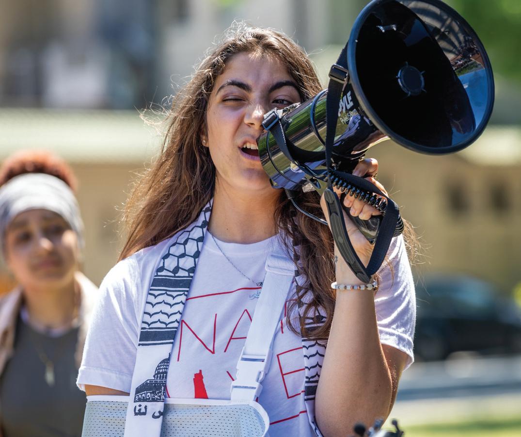 “This fight is not over until Palestenians get the freedom they deserve and the justice they deserve,” said VCU student Sereen Haddad, speaking from the back of a pickup truck, megaphone in one hand and her other arm in a sling due to injuries sustained during the police response to the encampment.