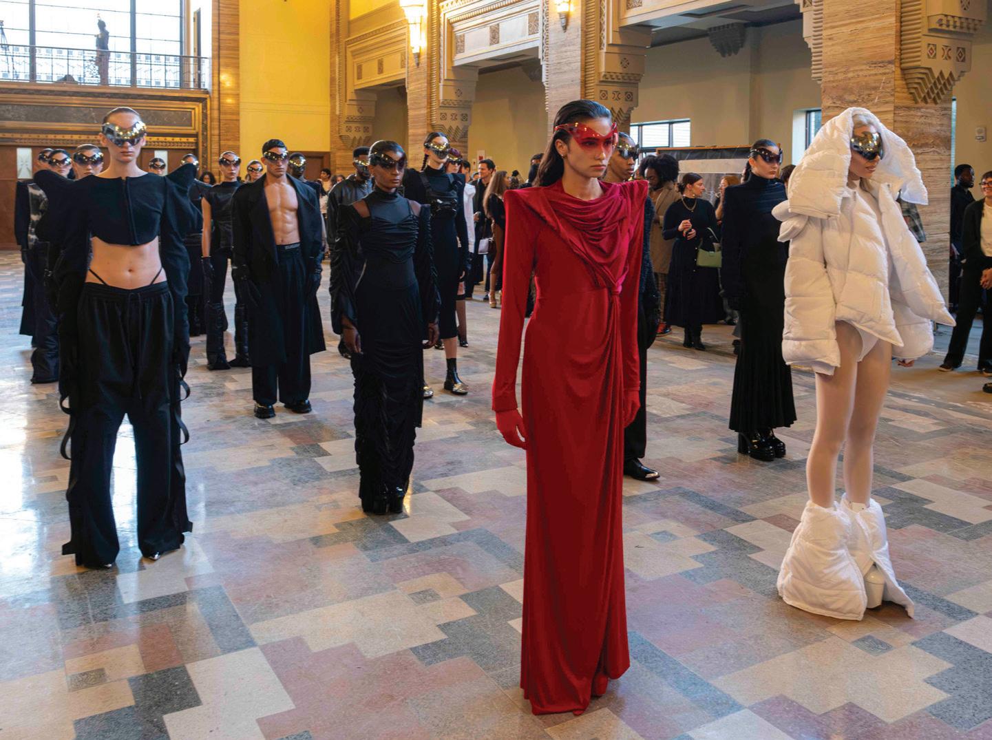 The pieces included dresses, coats and vests. Filipino-American rapper Roro Yone opened the show, setting the tone for the striking display. Stoic models strutted in 7-inch stilettos and bold, shoulder-padded outfits, captivating the audience lined along both sides of the runway. The show concluded with the models standing still as attendees took photos for several minutes.