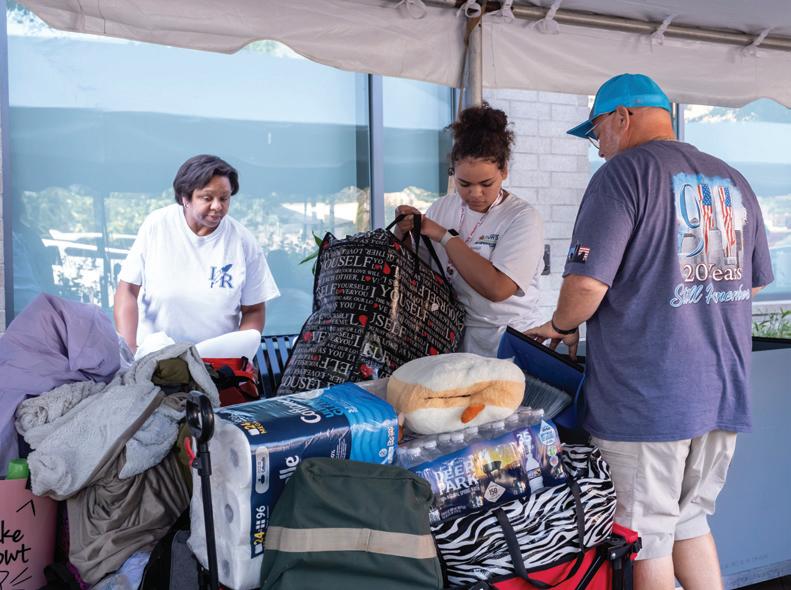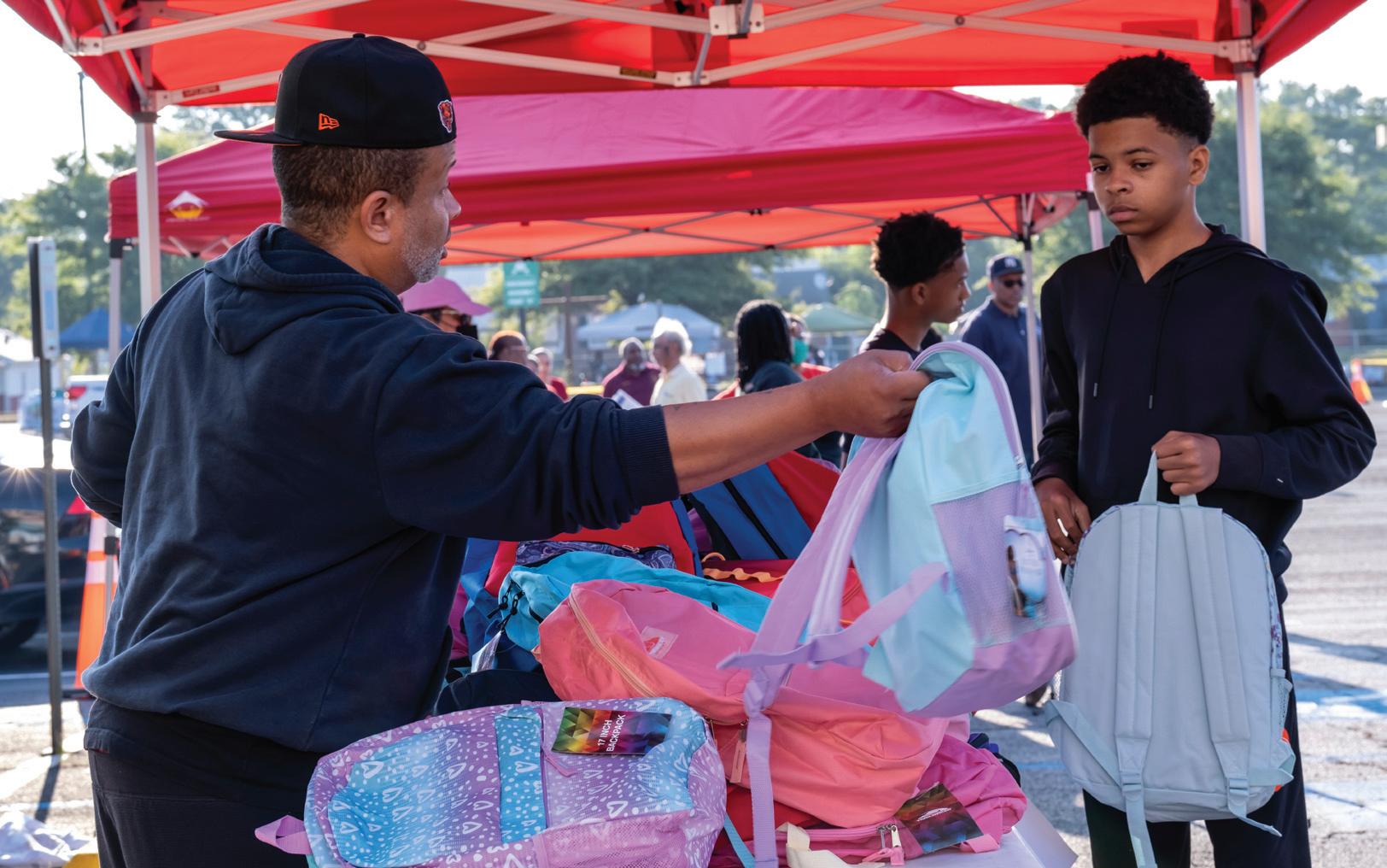 Treasure Woodson, 10, and Trinity Neville, 7, take in Second Baptist Church’s annual back-to-school event with their grandmother, Diana Neville, and 7-month-old cousin, Daelynn Neville on Saturday. Below, Wayman Hollis and his sons, Wayman Hollis Jr. and Landon Hollis, were in charge of organizing backpacks for the giveaway. Meanwhile, Second Baptist