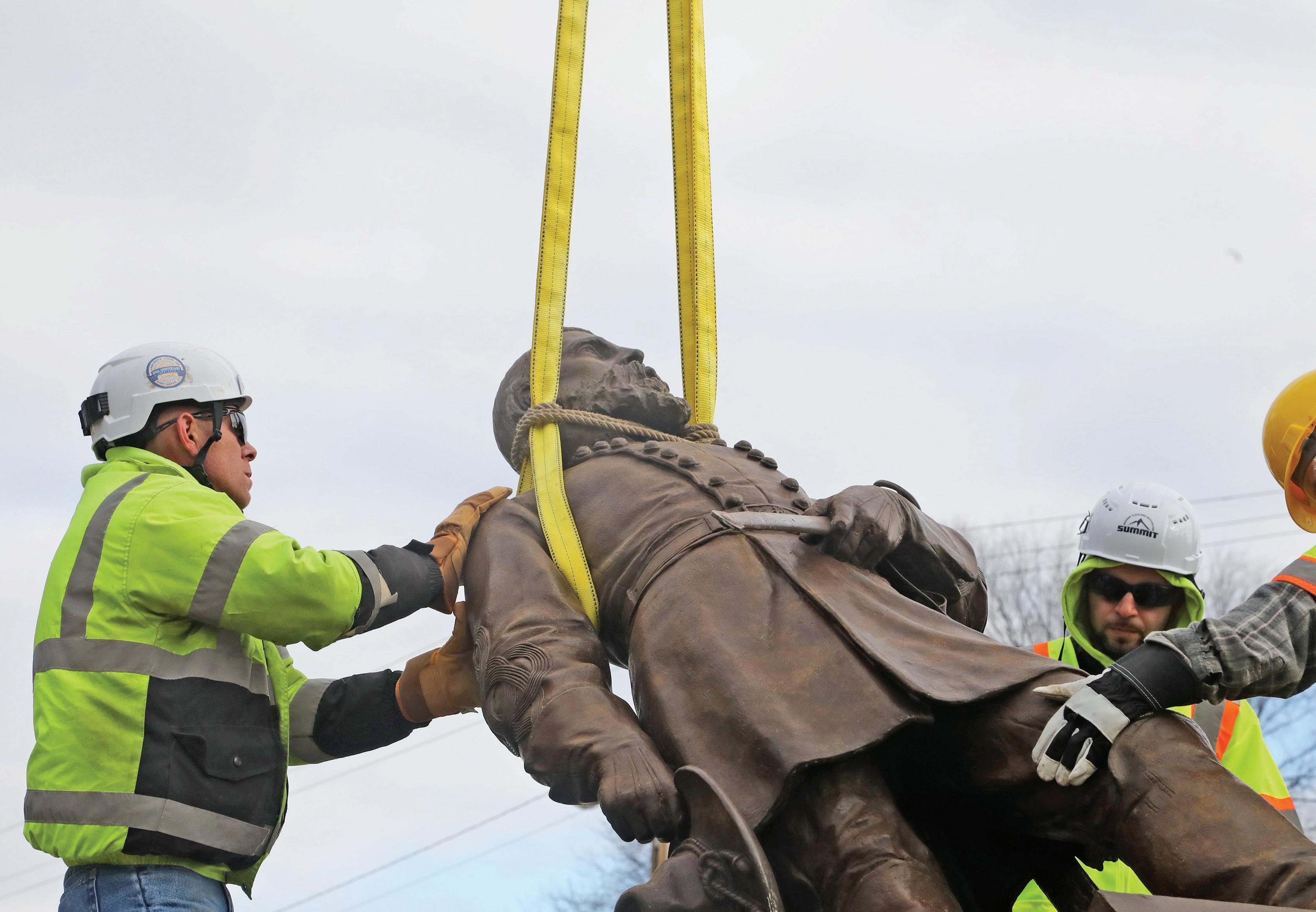 Team Henry Enterprises employees remove the A.P. Hill statue at the intersection of Hermitage and Laburnum on Monday. The statue of the fallen Civil War general was the last to stand on City property since the removal of other Confederate statues began in 2020.