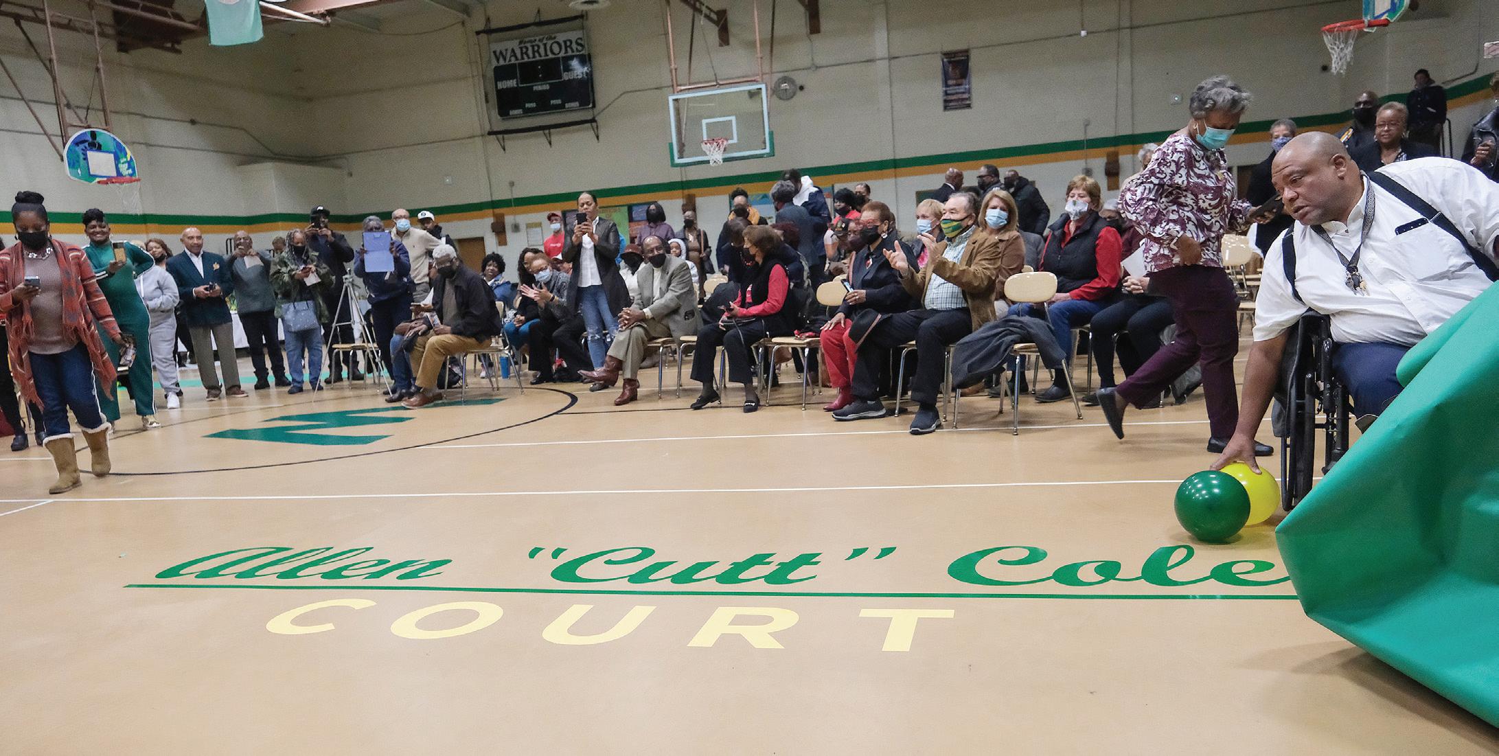 Kailyn Braxton, 6, and her mom, Bria Williams, the granddaughter and daughter of former deceased studentathlete Aldrey “Zach” Williams, carry a ball to be signed by players Dec. 10 at the dedication of the Coach Allen “Cutt” Cole Court at Henderson Middle School. More photos, B2.