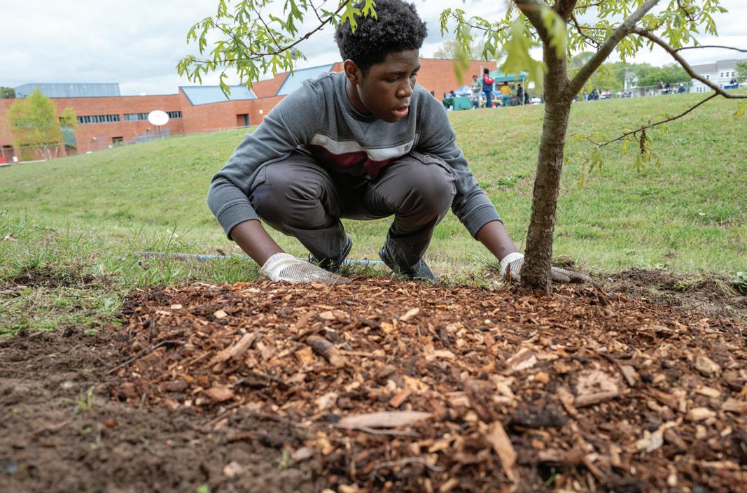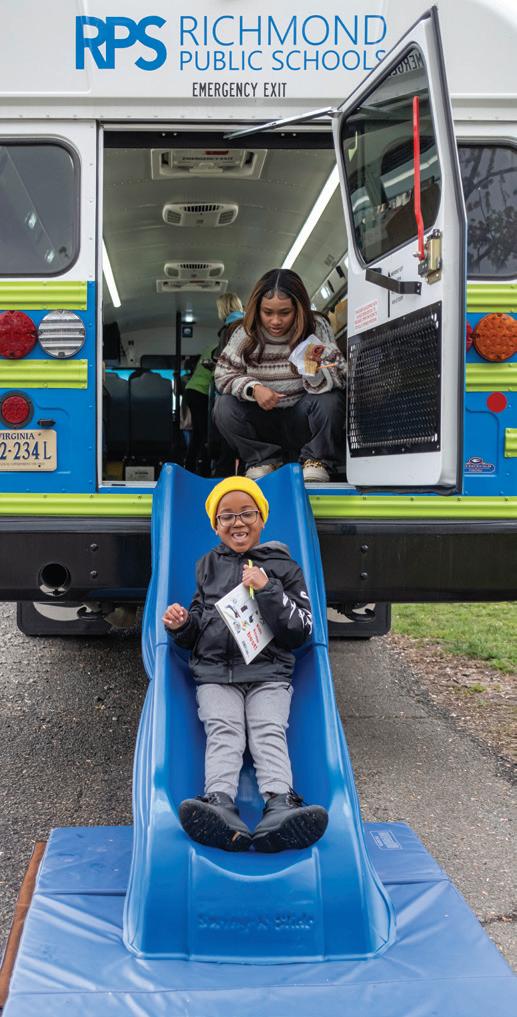 in 2020. Below, Richmond’s first Moon Tree, grown from seeds that orbited Earth and the moon during NASA’s Artemis I mission, was planted at Thomas C. Boushall Middle School through a partnership with the U.S. Forest Service and NASA. The project honors the legacy of the Apollo 14 mission. Right, six-year-old Titus Vaughn slides down from the Lit Limo after picking out a book as student Andie Butler looks on.