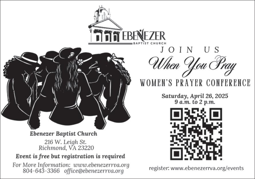 Speakers and prayer leaders include Corey Widmer of Third Church, Ben Campbell of St. Paul’s Episcopal Church, Lee Mitchell of New Life Baptist Church and Bishop Daniel Robertson Jr. of Mt. Gilead Full Gospel International Ministries, among others. Registration is required. No on-site registration will be available. For more information or to register, visit forrichmond.org.