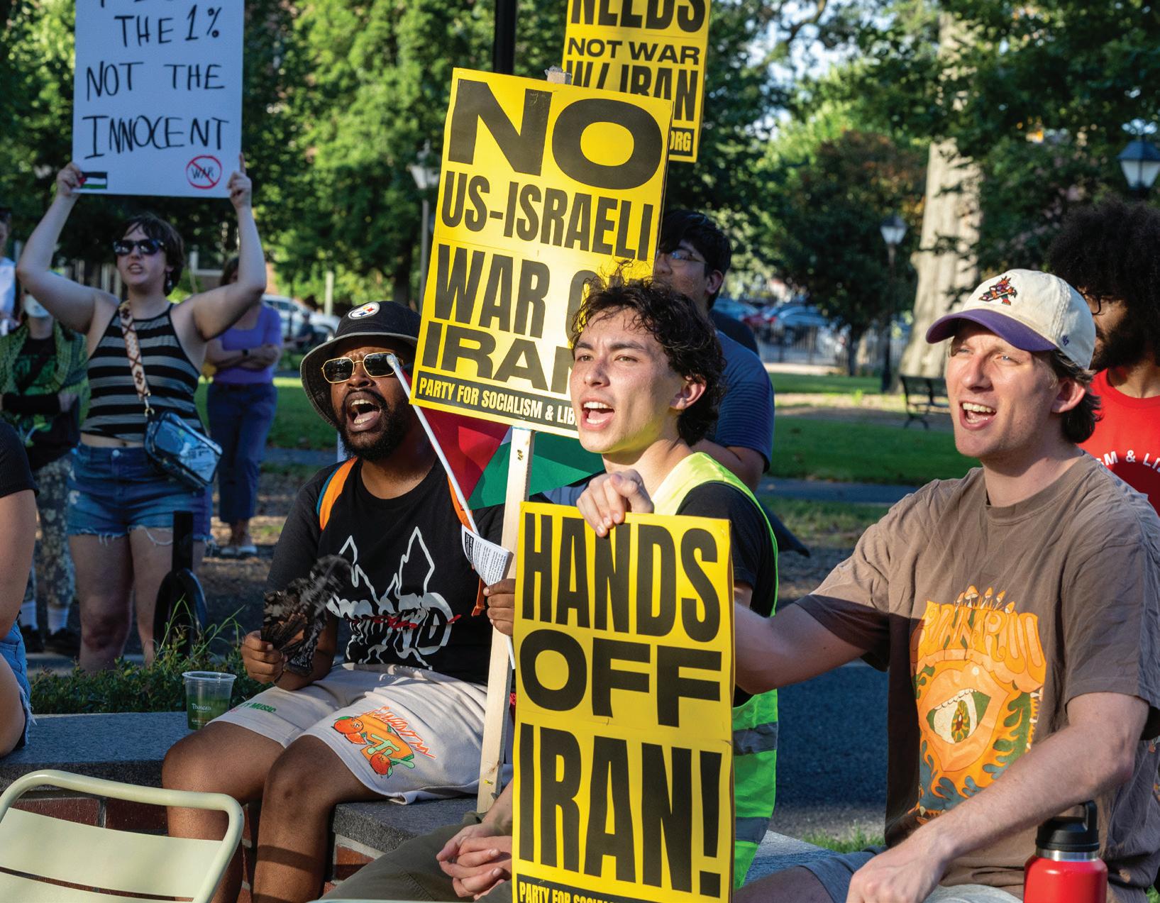 around the Checkers House in Monroe Park on June 18 for an “emergency” protest organized by the Party for Socialism and Liberation Virginia. Speakers from various groups denounced the conflict as well as the impact of the war in Gaza on Palestinians.