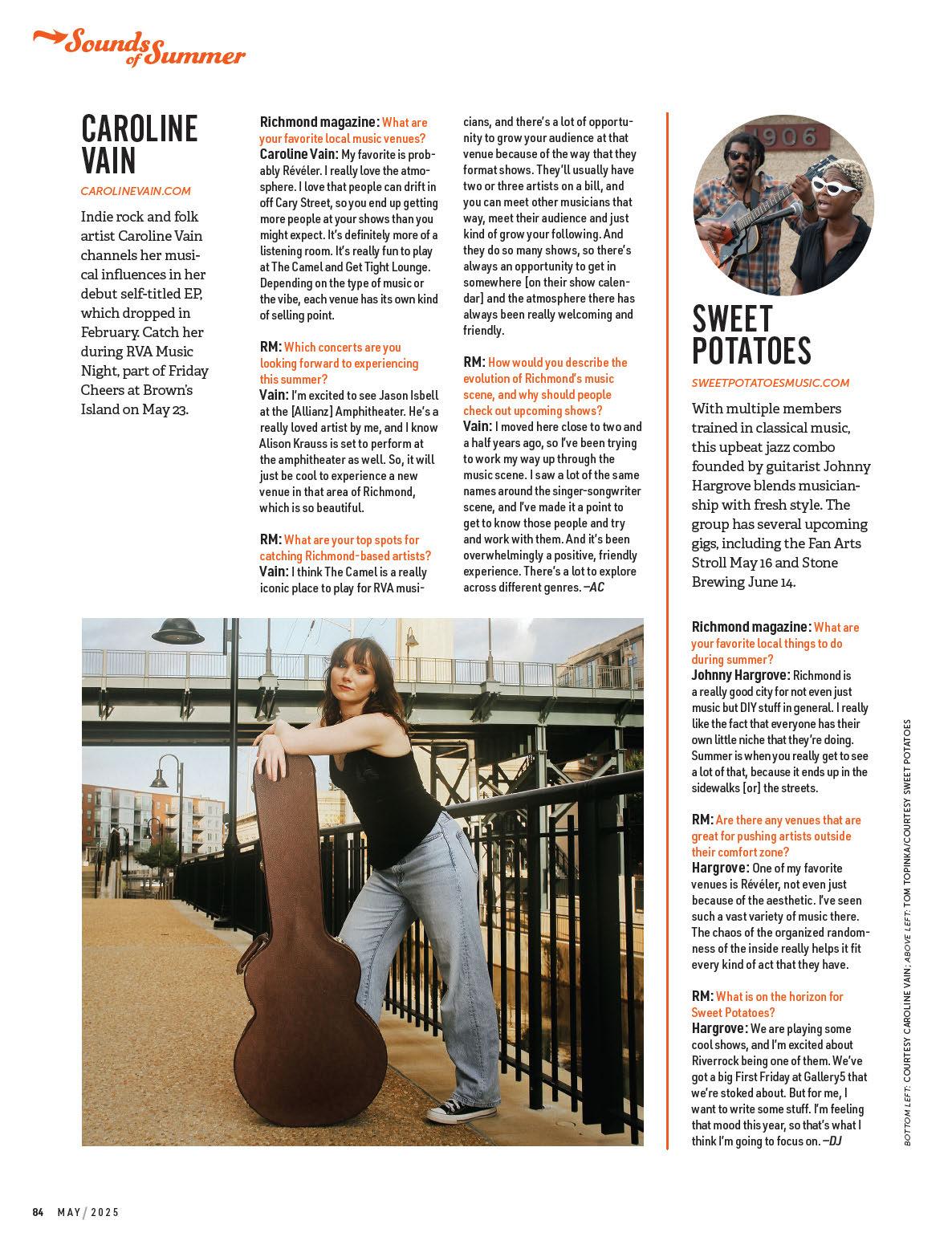 Grishaeva recommends that concertgoers look beyond the festivals for choice music at local venues such as The National and The Camel. She also mentions under-the-radar spots with pop-up performers. “I’m a bit more tapped into the local house show scene, but those houses are constantly changing, so what I would say is try to keep the everchanging houses on your radar,” she says.