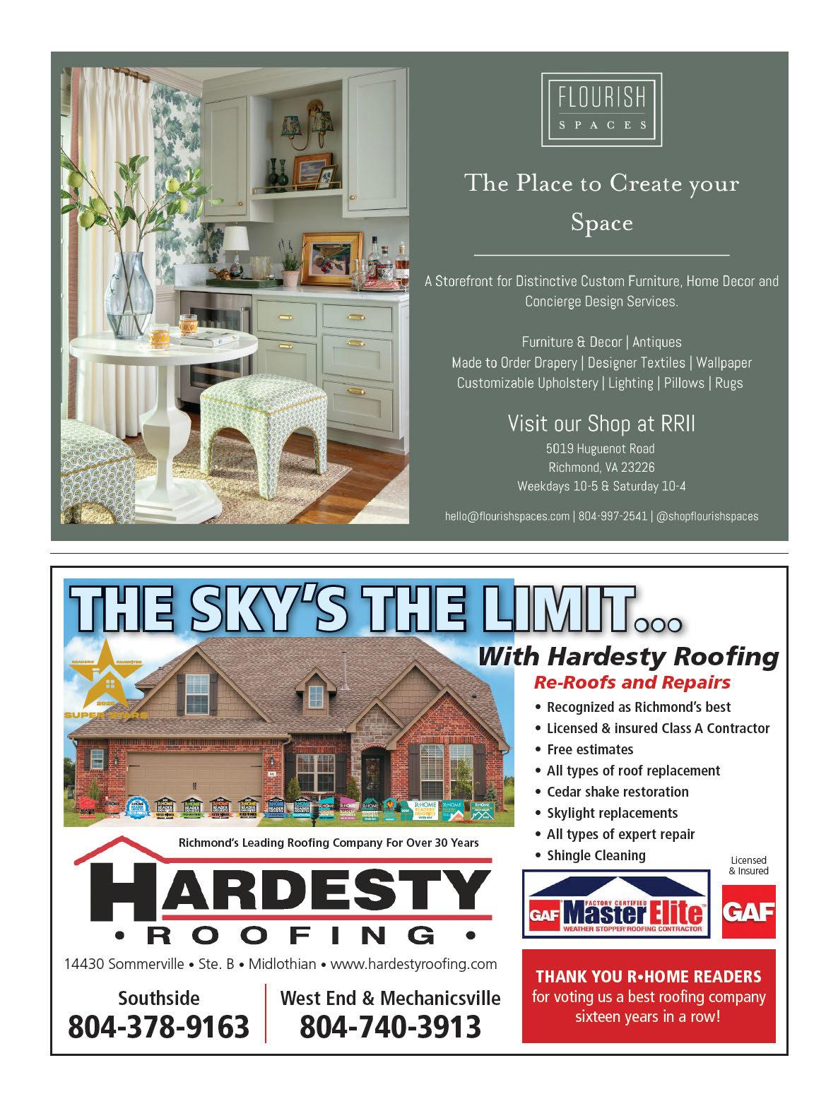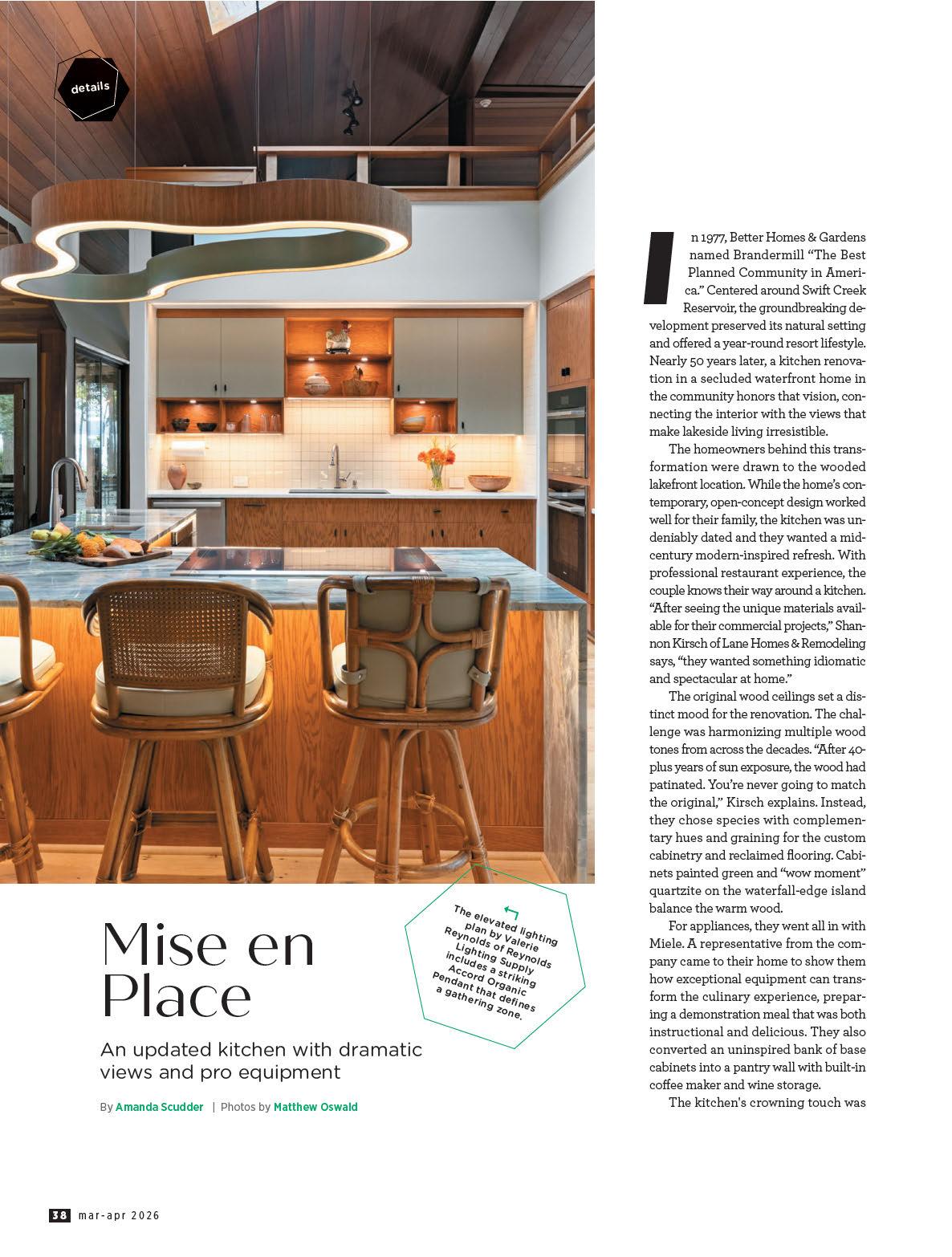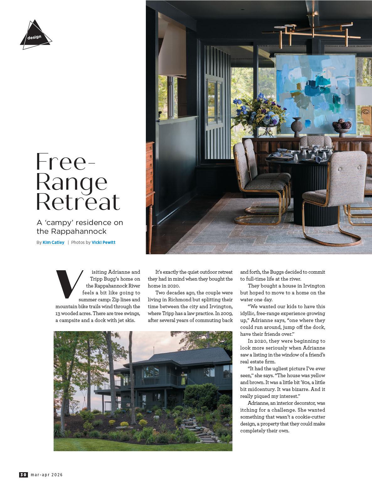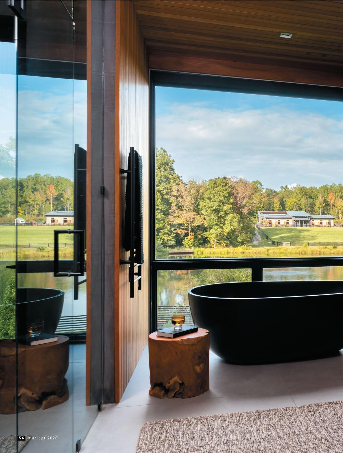 the pond. Downstairs, a second porch provides a gathering space for the kids and their friends. In the side yard, they’ve added gardens and space for corn hole and volleyball. And when the Buggs built a dock, they added enough room at the end for four chairs and a co ee table.