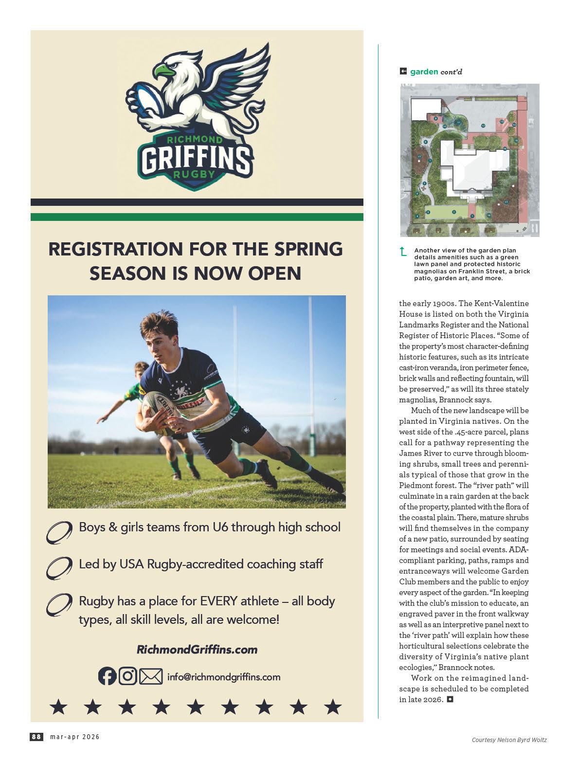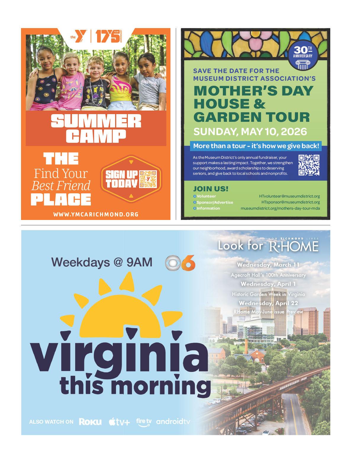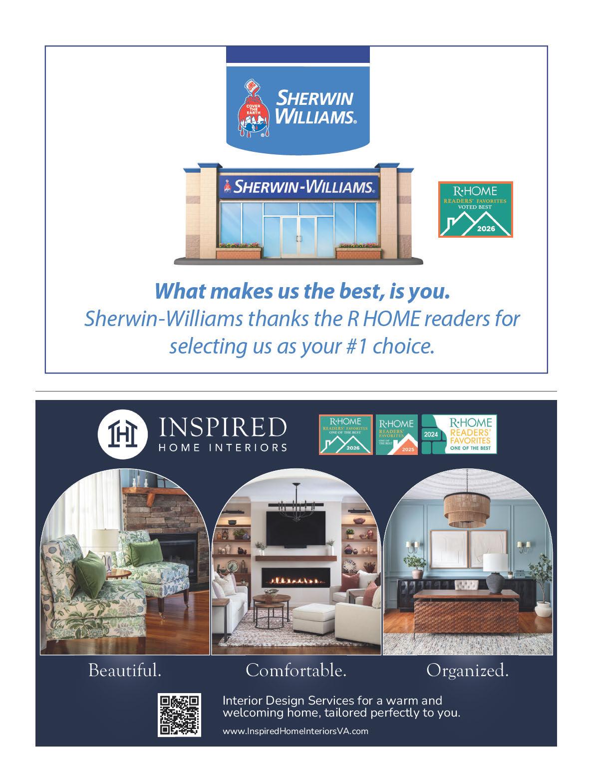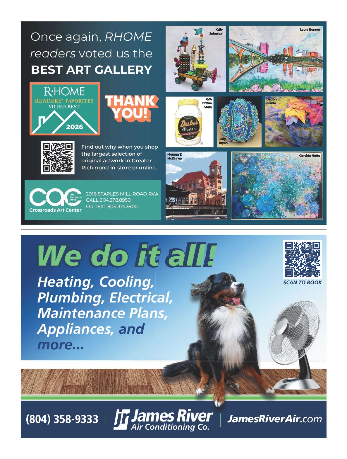 the pond. Downstairs, a second porch provides a gathering space for the kids and their friends. In the side yard, they’ve added gardens and space for corn hole and volleyball. And when the Buggs built a dock, they added enough room at the end for four chairs and a co ee table.
