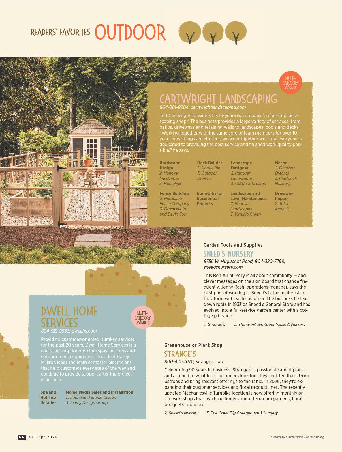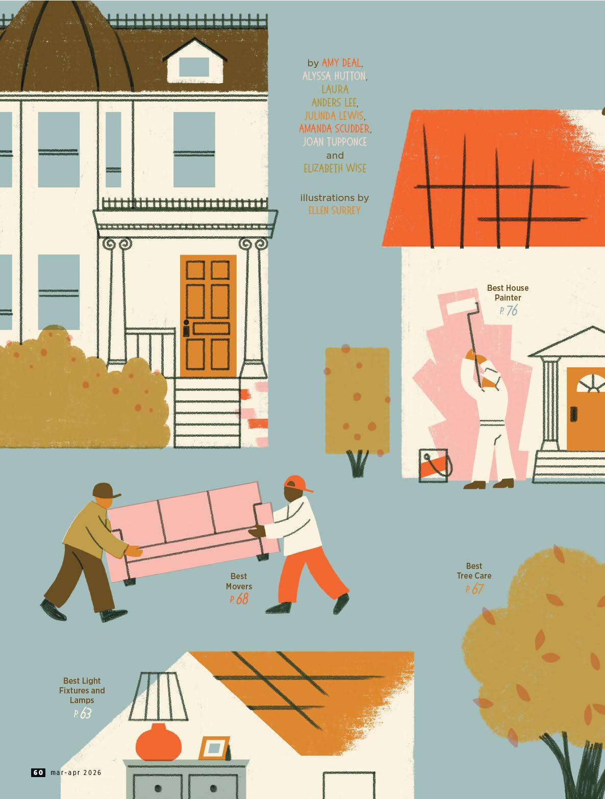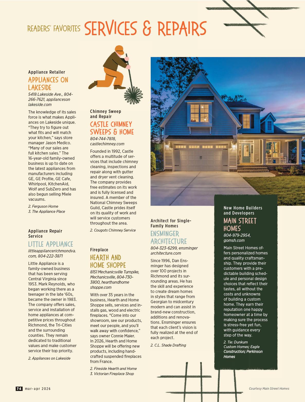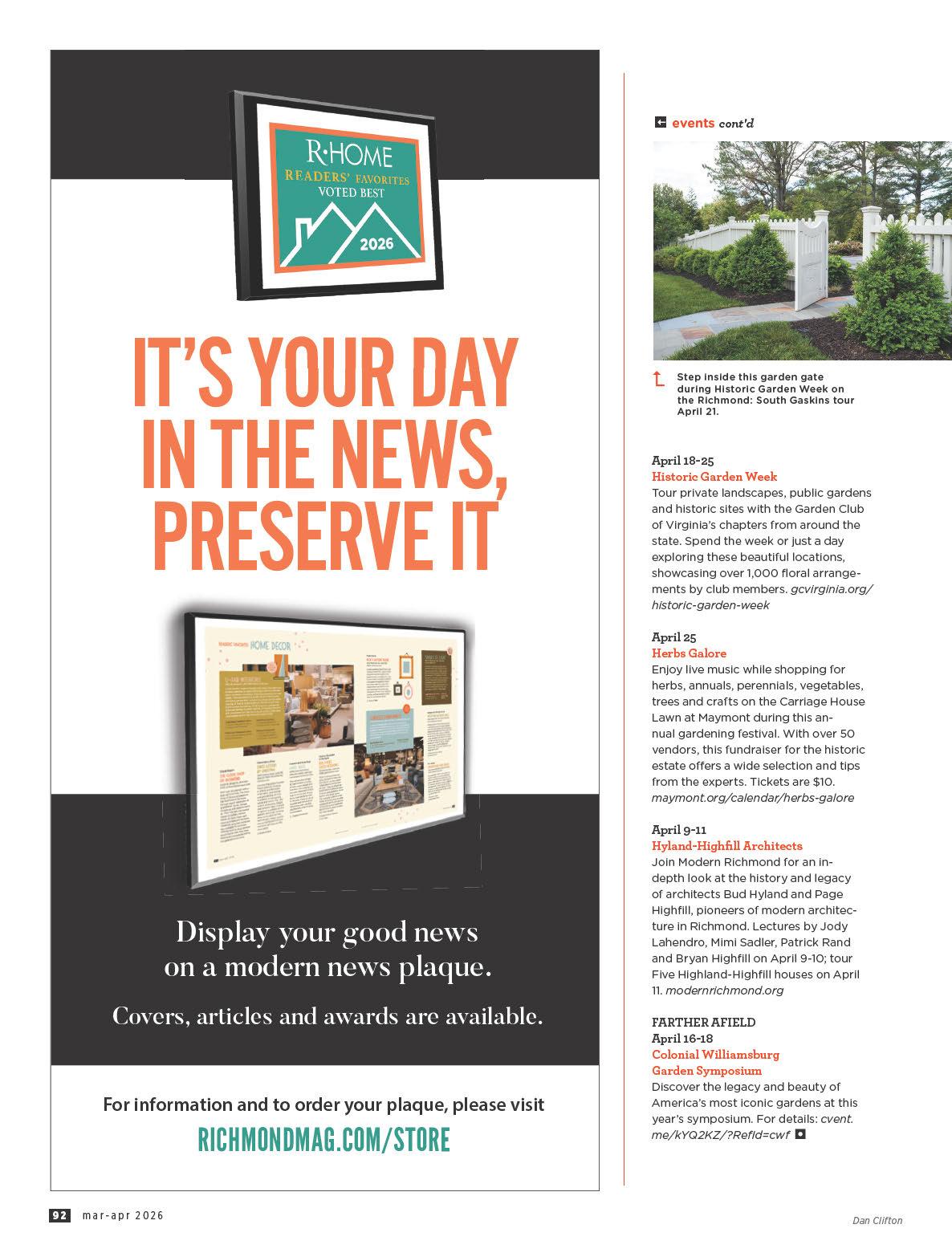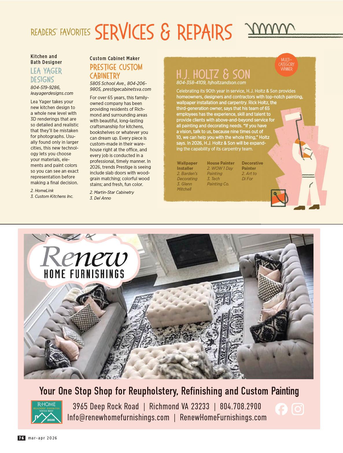 the pond. Downstairs, a second porch provides a gathering space for the kids and their friends. In the side yard, they’ve added gardens and space for corn hole and volleyball. And when the Buggs built a dock, they added enough room at the end for four chairs and a co ee table.