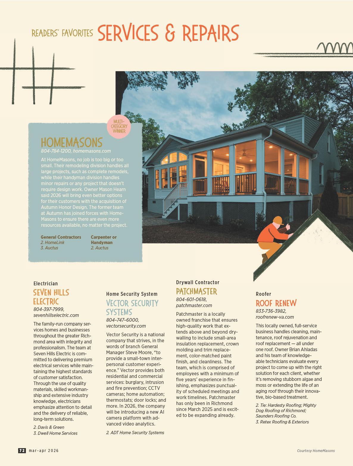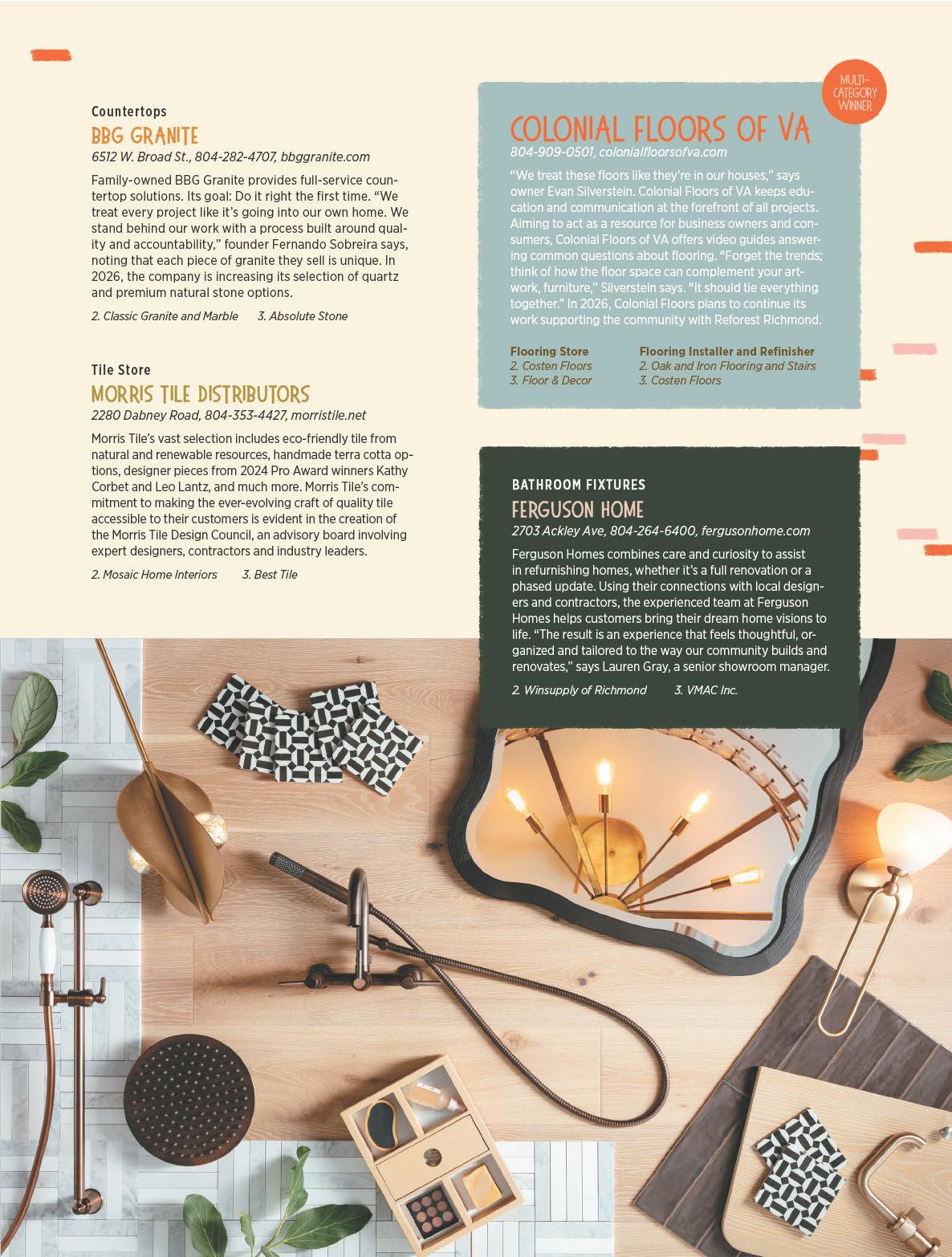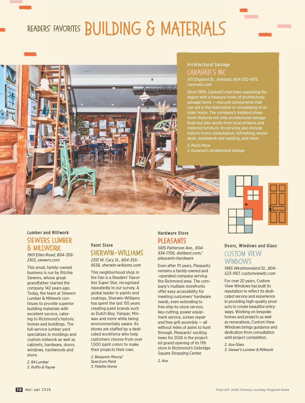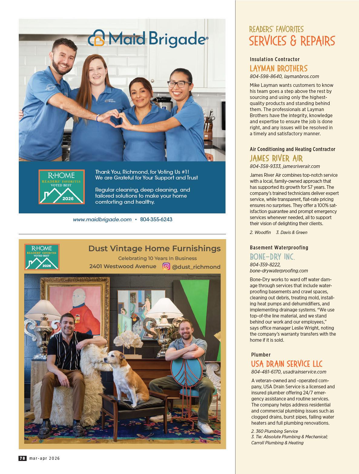 the pond. Downstairs, a second porch provides a gathering space for the kids and their friends. In the side yard, they’ve added gardens and space for corn hole and volleyball. And when the Buggs built a dock, they added enough room at the end for four chairs and a co ee table.
