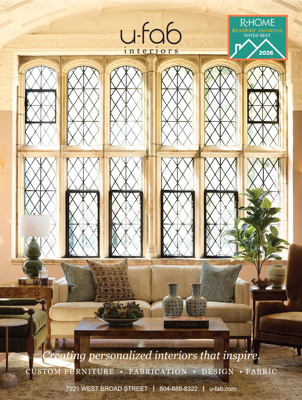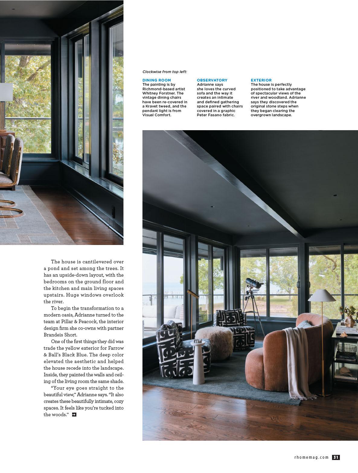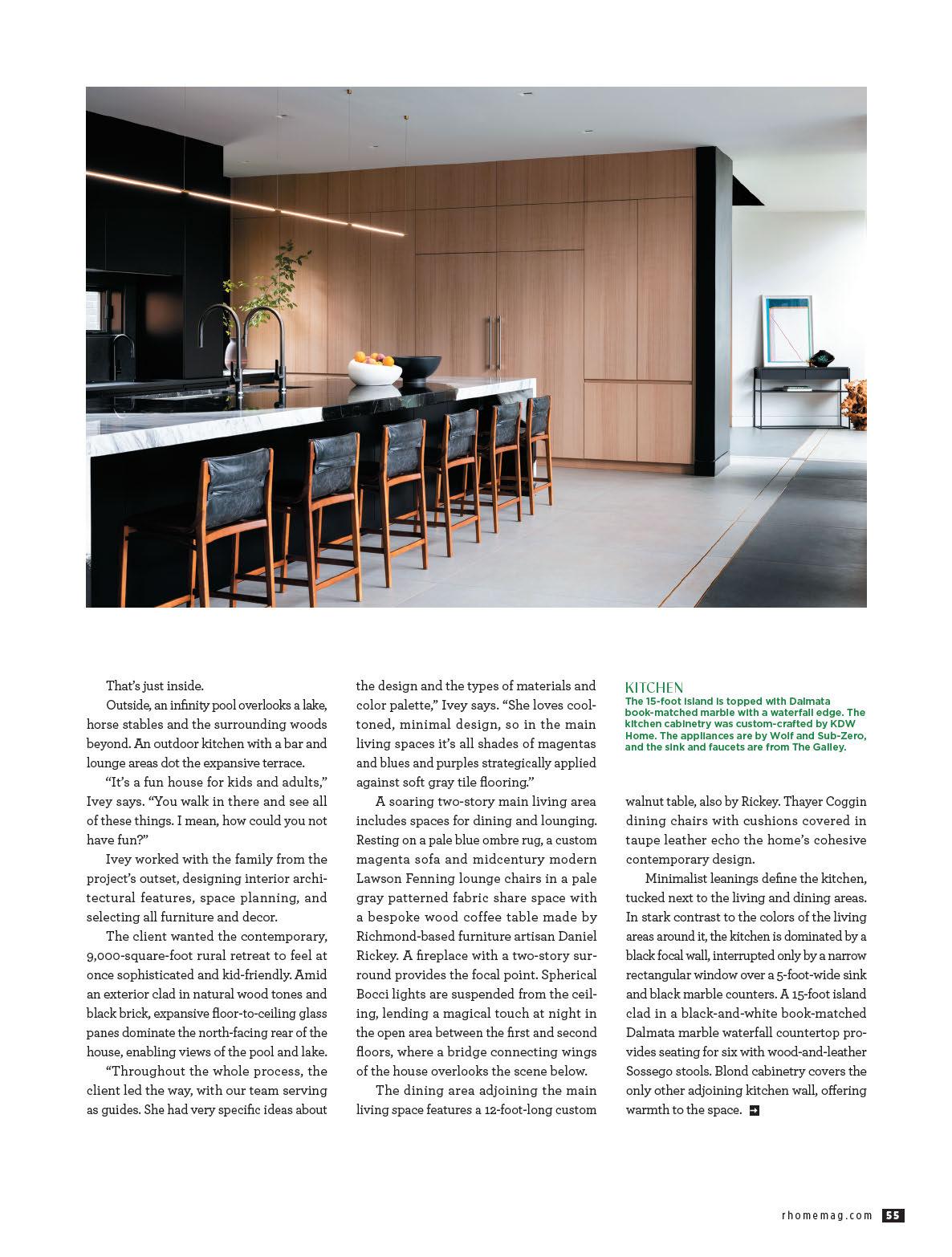 Double-height two-story windows look toward the verdant landscape. The handcrafted 12-foot walnut dining table and co ee table were custom-made for the space by Richmond furniture maker Daniel Rickey, and the sofa console was handmade by Richmond-based craftsman David Bohnho . The sofa and ombre rug were also custom-designed for the project.