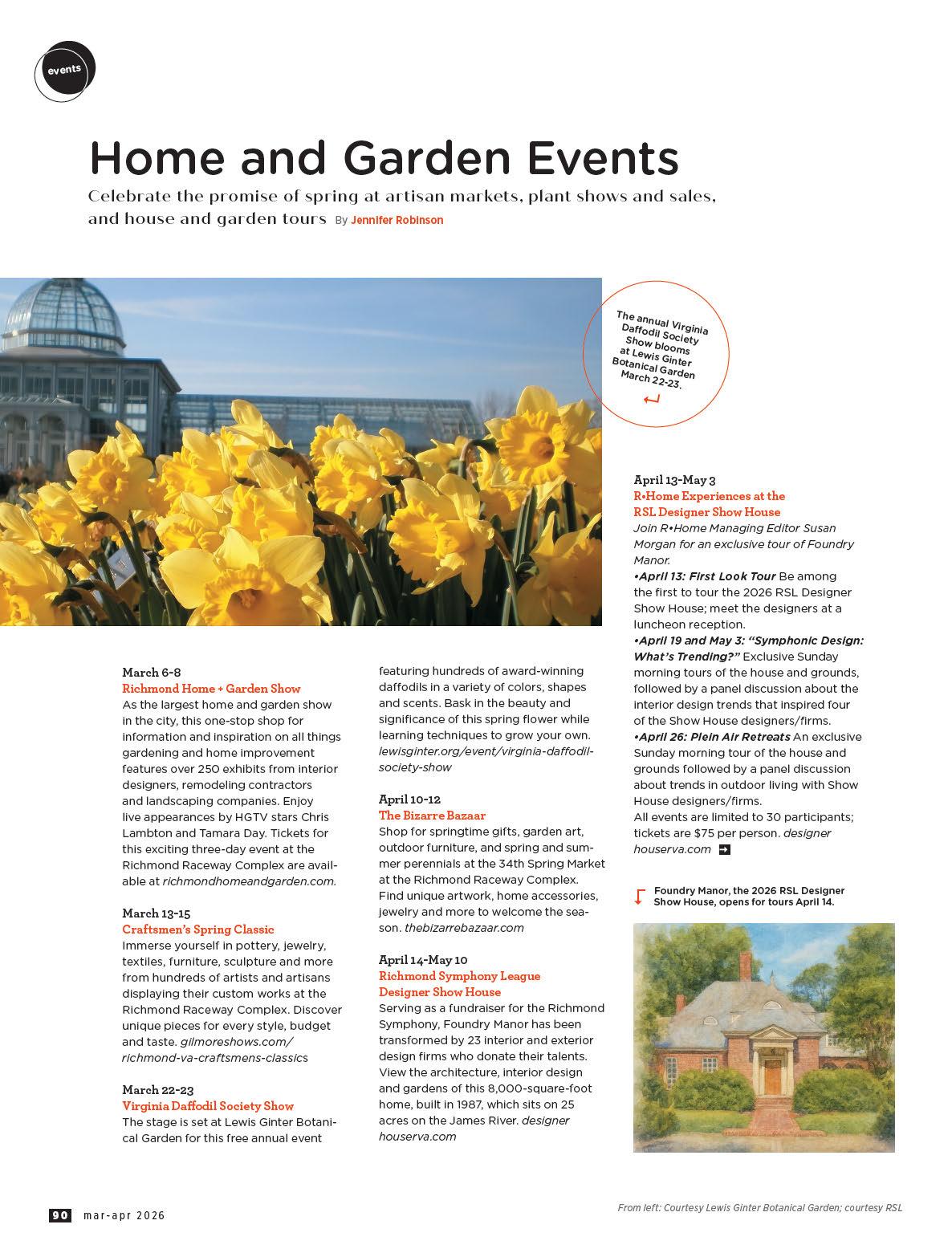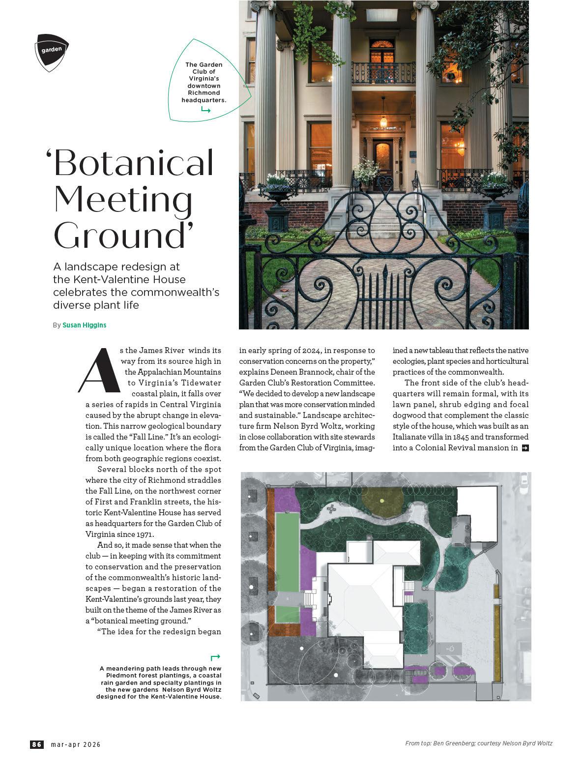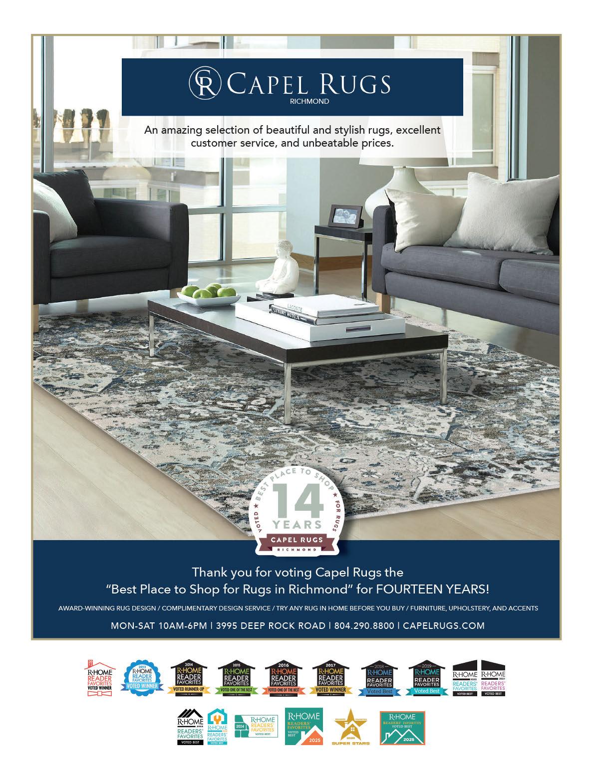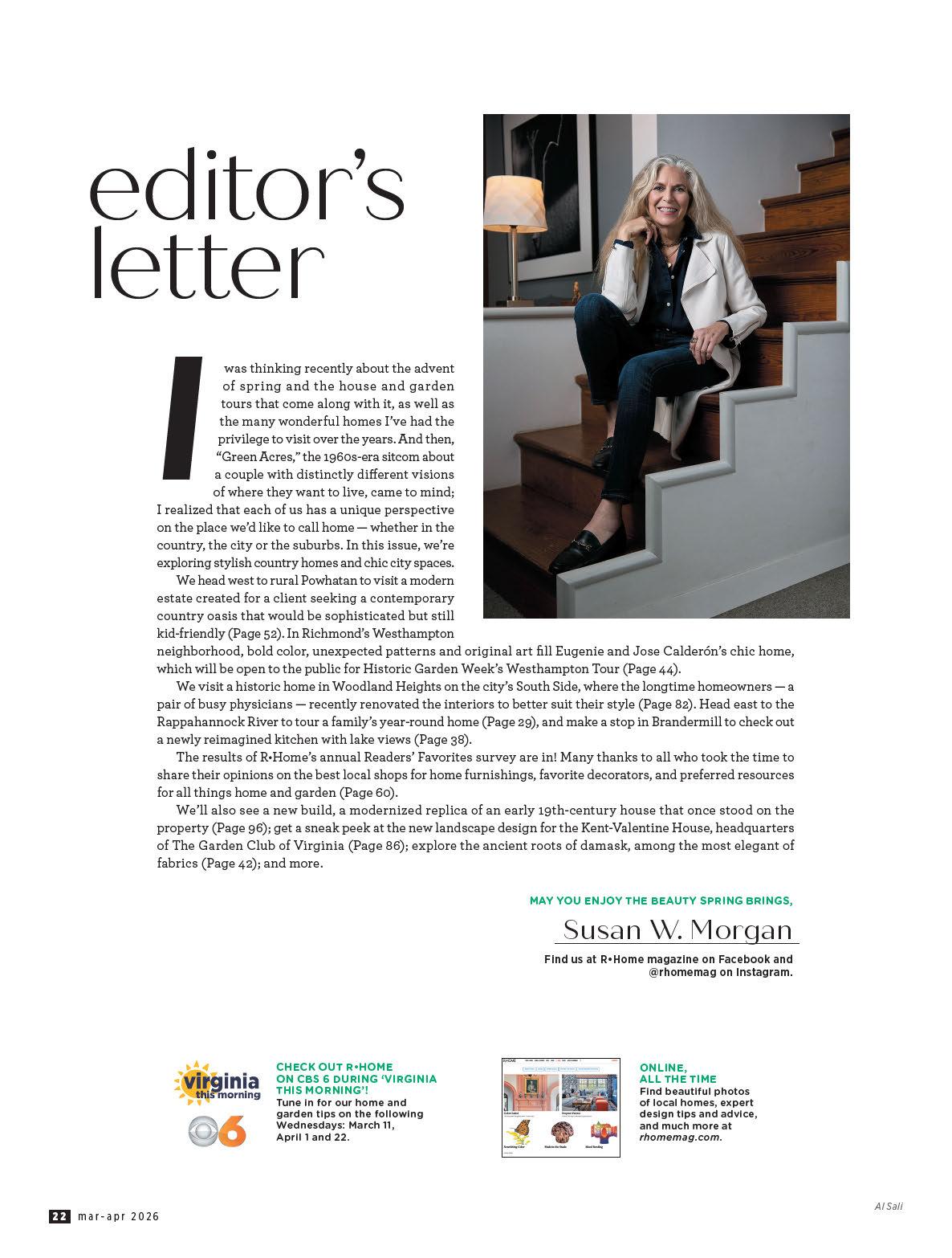 Double-height two-story windows look toward the verdant landscape. The handcrafted 12-foot walnut dining table and co ee table were custom-made for the space by Richmond furniture maker Daniel Rickey, and the sofa console was handmade by Richmond-based craftsman David Bohnho . The sofa and ombre rug were also custom-designed for the project.