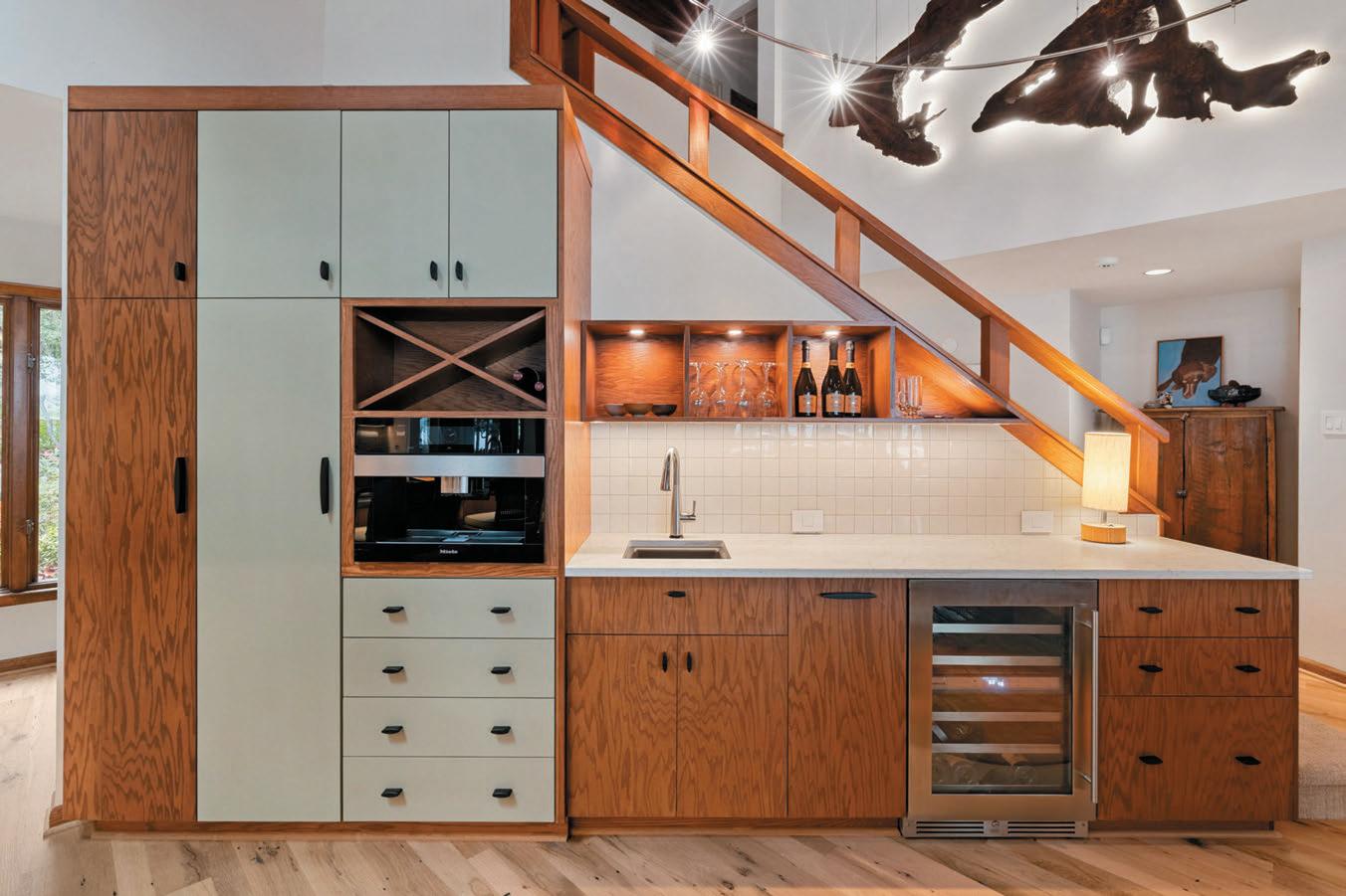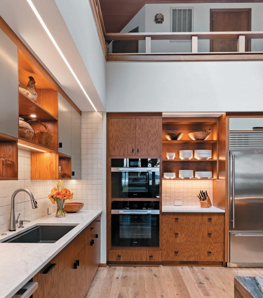 Bespoke cabinetry by Harper & Taylor Custom Woodworks enhances the midcentury aesthetic and incorporates open shelving for display. The perimeter cabinets have Emerstone quartz Naica countertops.
