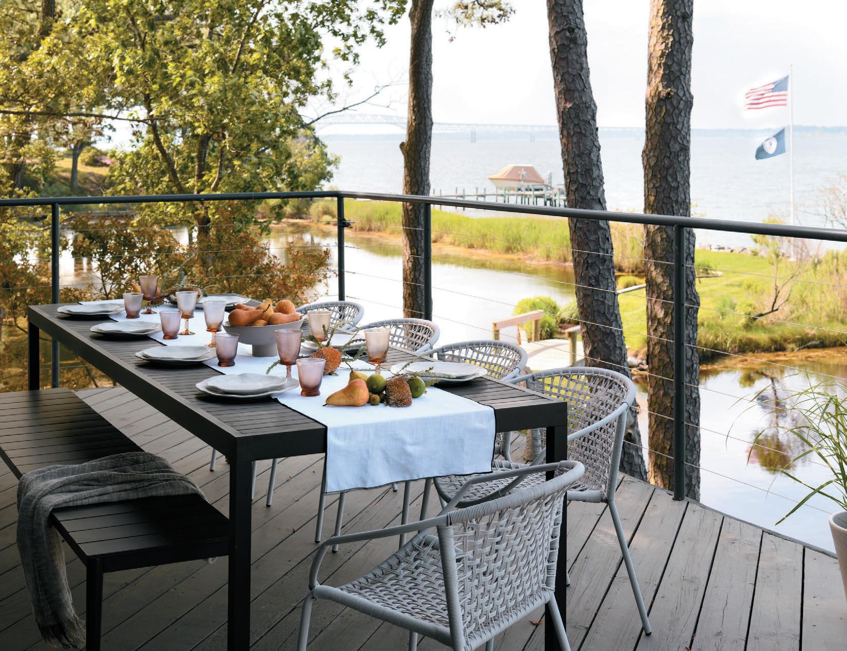 Outside, family and guests naturally gravitate to the fire table and dining area on a second-story porch that extends over