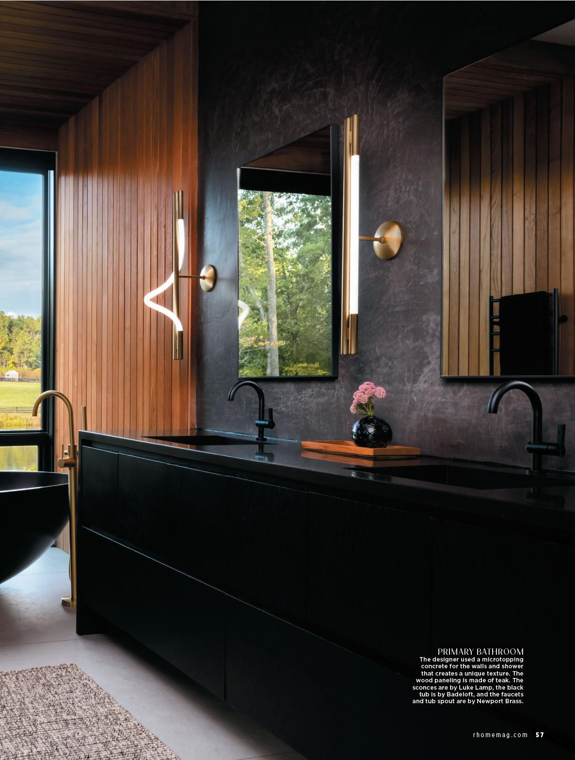 A first-floor powder room near the stairs features a similar design treatment. A dramatic black-and-white marble peppered with green, blue and taupe veins on the vanity and wall above creates an exotic experience. Highlighting the mood is a mirror layered with asymmetrical rectangular lighting. The primary bathroom is also dressed in a complementary contemporary design, with a black soaking tub, black double vanity and textured black wall treatment set against warm wood panels that flank the tub.