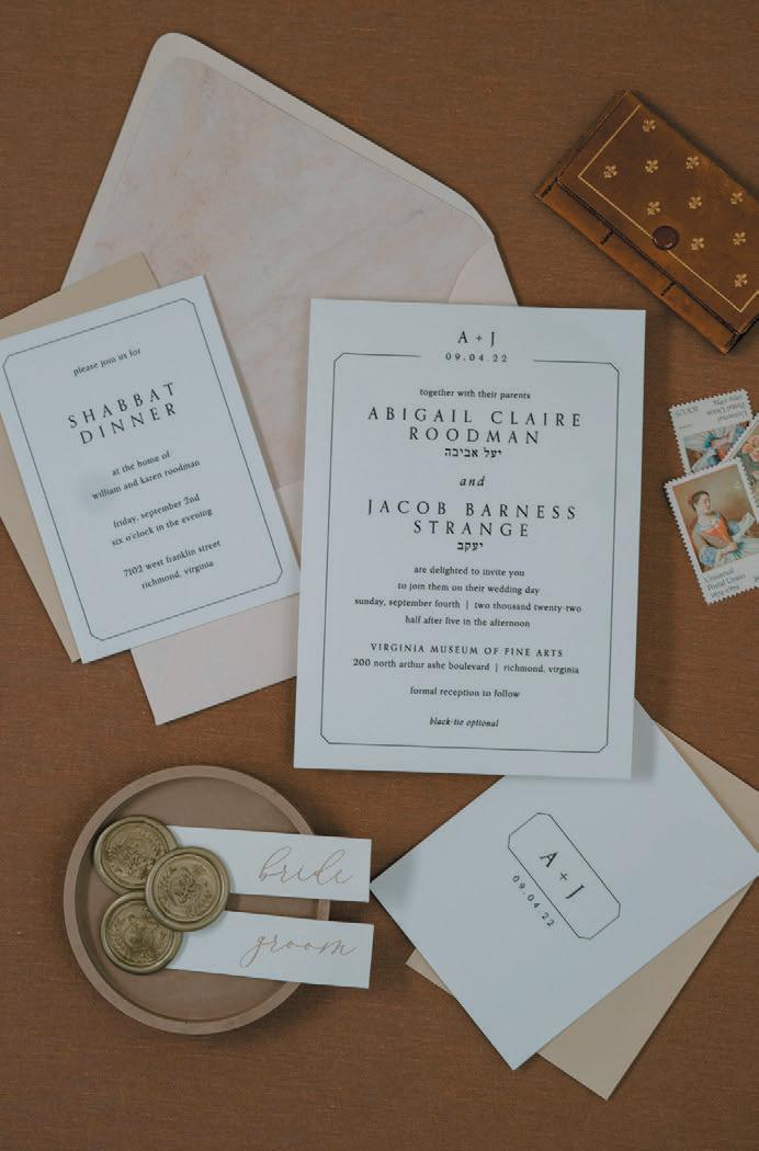 CLASSIC TASTE: Tiger Lily created the custom wedding invitation suite, including an invitation to the bride’s parents’ home for a traditional Shabbat dinner the Friday prior to the wedding. The decorative items were sourced from the VMFA.