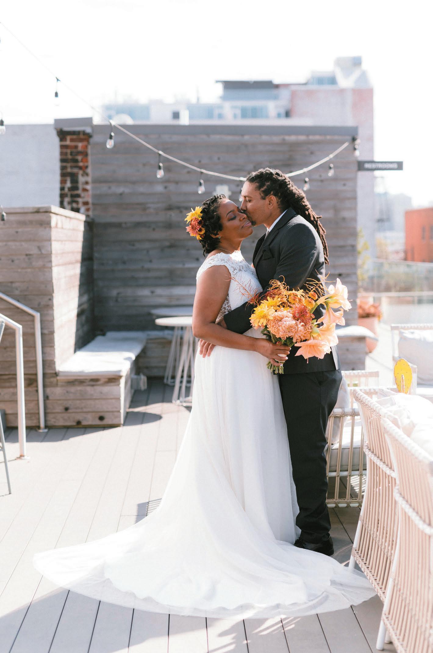 CITY VIEW: Blake and Vera got ready in separate suites at the Graduate Richmond, then took photos at the rooftop bar. Her boho, fitted lace gown was purchased from Blue Sage Bridal and his gray suit was from Men’s Wearhouse.