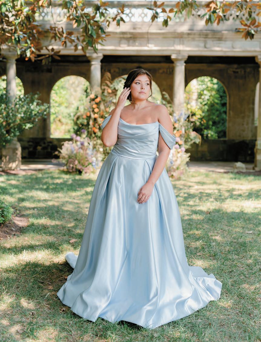Left: The “Sapphire” gown by Soleil James at Blue Sage Bridal is an example of color infusion in wedding-day apparel.
