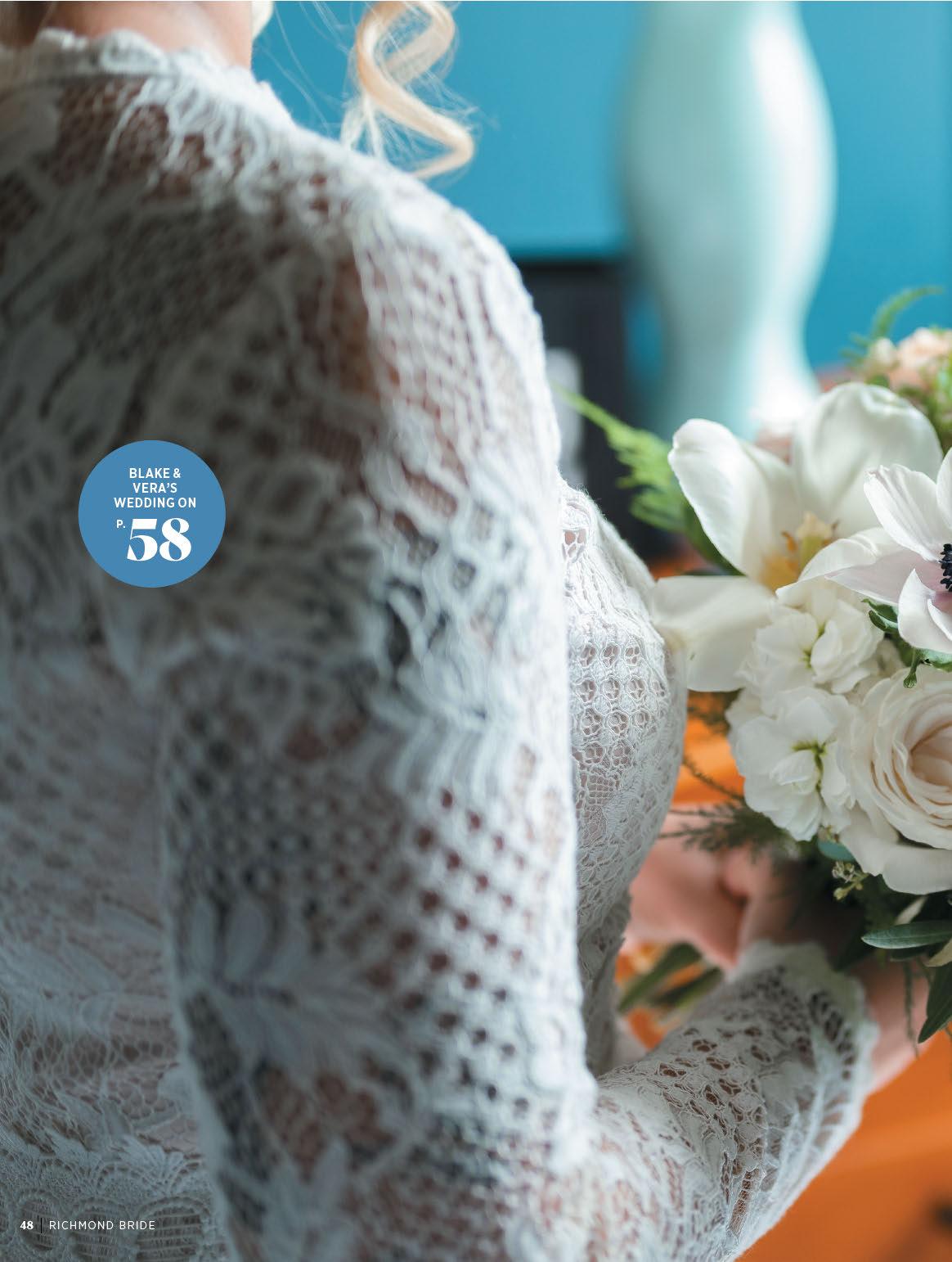 The low-key couple opted to have their wedding at the Visual Arts Center of Richmond, where Vera formerly worked as a special events manager. Their ceremony and reception took place in the center’s spacious outdoor courtyard. For their DIY event, Blake and Vera enlisted the services of as many local and/or independently owned vendors as possible, many of whom are close friends or family. “My mom and sister own a floral boutique in Charlotte, North Carolina, so it was really cool to have them decorate our wedding,” Blake says.