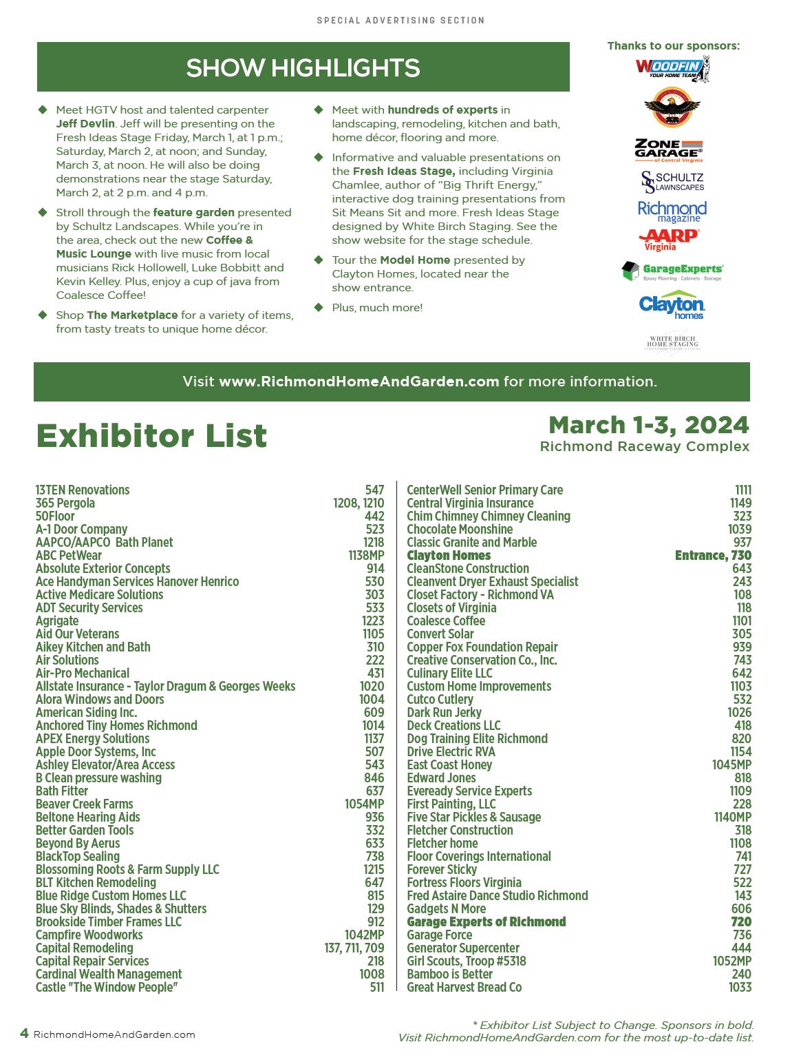 * Exhibitor List Subject to Change. Sponsors in bold. Visit RichmondHomeAndGarden.com for the most up-to-date list. RichmondHomeAndGarden.com 5 SPECIAL ADVERTISING SECTION Green Home Solutions 1034 Herman Allen Plumbing, Heating & Cooling 113 Home Depot 1117 Home Smart Industries 916 Homefix Custom Remodeling 119 Howell's Heating and Air 913 Human Touch 1125 Hydrokleen 1016 Ion Solar 619 James River Air 1121 James River Exteriors 745 James River Kitchens 1017 Jameson Medical 1141 JDS Bath 236 Jeanine Michele Enterprises 127 JES Foundation Repair 219 Kitchen Doctors 104 LA Painters 705 LeafFilter North LLC 611 LeafGuard 340 Lot Scapes 513 Luxury Pool & Spas / Hot Tubs To Go 229 Luxury Shower & Glass 713 M.C. Fence & Deck 812 Maid Right of Richmond 528 Marlowe's We Care Company 337 Master Electrical Services LLC 706 Mattress Savvy 519 Mercury Builders 951 Merry Maids of Fredericksburg, Richmond and Warrenton 123 Mia Bella's - Calvary Hill LLC 1041 Mija's Designs 1257 Milligan Custom Cabinetry 407 Miracle Method Surface Refinishing 518 Mission Realty - Sommer Baumfalk 941 Mitchell Homes, Inc. 422 Mobility Works 645 Mosquito Authority 1147 Mosquito Sheriff 1012 Mosquito Shield of Richmond 746 Mr. Fix-It 114 MSI Surfaces Richmond 808 Nature Hill NV 613 Neat Sweep Ltd. 133, 131 Nectar of the Vine 1112 New Image Cleaning Service 710 NextHome Advantage 911 Ogburn Construction Inc 749 Old Dominion Floor Company 910 Original Mattress Factory 920 Pampered Chef 429 PaperPie with Some 1048MP Paragon Construction Co. LLC 822 Parallel Nursery 1217 Paramount Builders / Virginia Shower & Bath 409 Passanante's Home Food Services 141 Patio Enclosures 942 Pella Window & Door Co. 307 Picture Perfect Sheds 701 Plants with Purpose Farm 1224 PlumbLife Plumbing 342 Pressure Works Inc. 834, 828 Priority Home Solutions, LLC 432 Pro Renovations 241 ProLift Garage Doors Of Richmond 733 Refresh Cabinets, LLC 829 Remodel USA 848 Renewal by Andersen of Central Virginia 237, 931, 443 Retex Roofing, LLC 627 Rivertree skylights 1015 Roman Construction Consulting 737 Ronnie Jenkins Windows 943 Roof Renew 929 Rooftop Chimney Sweeps 927 Sawmill Surplus 138 Scentsy 1134MP Schultz Lawnscapes 1019 Scott Ellis Painting 427, 842 Semper Fi Exteriors 921 Serenity Plumbing Inc 631 Shade & Louver 211 Shaheen Law Firm 110 Shanco Companies 816 ShelfGenie 626 Shutter Company 621 Sit Means Sit Dog Training 421 Smallwood Renovations LLC 514 Smith Strong, PLC 723 Solar Provider 940 Spinnaker Resorts Williamsburg 844 Star Blink Products Inc 732 Stoneridge Outdoor Living 330 Sundecks of Richmond 740 Superior Sleep 329 Tastefully Simple 1040 Teresa's CleanSweep 1053MP The Drying Company 527 The Good Feet Store 813 The Hardscape Center 953 The Home Doctor Exterior 140 The Mattress Hub, Sleep Events 1228 The Village Shed Store 841, 946 ThermaCool LLC 712 TheTriadAer.com 230 Thompson Creek Window Company 838 ThugBusters LLC 1043MP Titanium Exclusive Cookware 725 TLC Landscape Curbing 231 T-Mobile USA, Inc. 539 TnL Sales 810 TNR Group 744, 136 Top Tier Solar Solutions 1006 Tori's Company LLC 1027 Tower Garden - Aeroponic gardening system 1035MP Traeger Grills 322 Trinity Renovations Inc./Legacy Amish Furniture 311 True Honey Teas 1113 Tuff Shed Inc 1153 Tupperware - Penny Ellis 1044MP Turnkey Porch Enclosures formally Sunspace of Richmond 835 U.S. Jaclean, Inc. 319 University Painters 721 Upgrade Remodeling 1010 Va Engineering Services, LLC 1022 Vacation Village Resorts 101 Valley Landscaping 1216 Vector Security 915 Virginia Exterior Products Corporation 306 Virginia foundation Solutions 1018 Virginia Outdoor Lighting 930 Virginia Power Solutions 649 Virginia Railing and Gates 549 Wealth Innovations LLC 722 Westgate Resorts 1036 Whit e Birch Home Staging 1110 White Glove Plumbing-Heating-Air 1143 Window Depot USA of Richmond 437 Woodfin - Your Home Team 501 Wyndham Vacation Resorts Inc. 934 Xfinity 1002 X-Terior Techs 917 Zerorez 439 Zone Garage of Central Va. 331