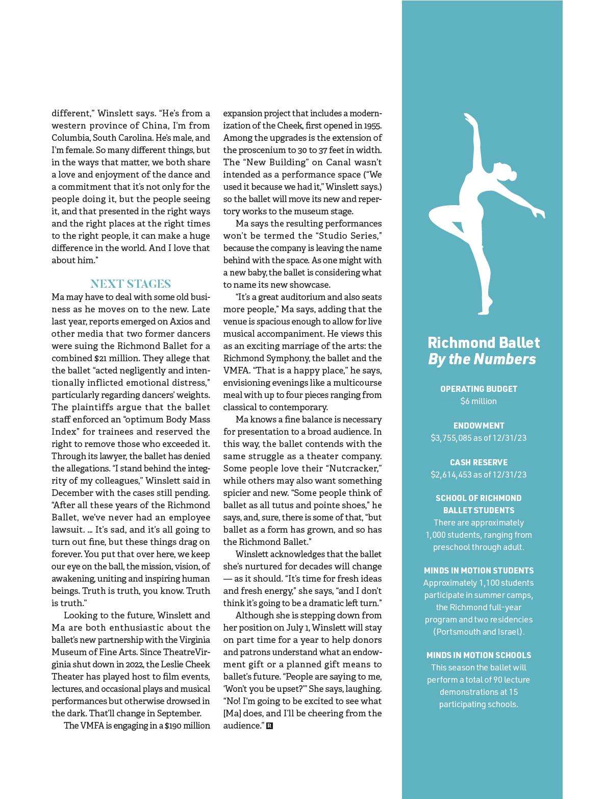achievement for any leader — Winsle is stepping down from her position as artistic director of the Richmond Ballet and turning leadership over to her handpicked successor, Ma Cong. She takes a deep breath. “Everything mushroomed,” she says. “When you look back at an era, you don’t know when it started until it ends.”