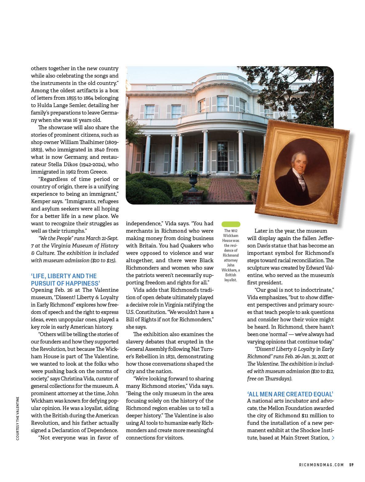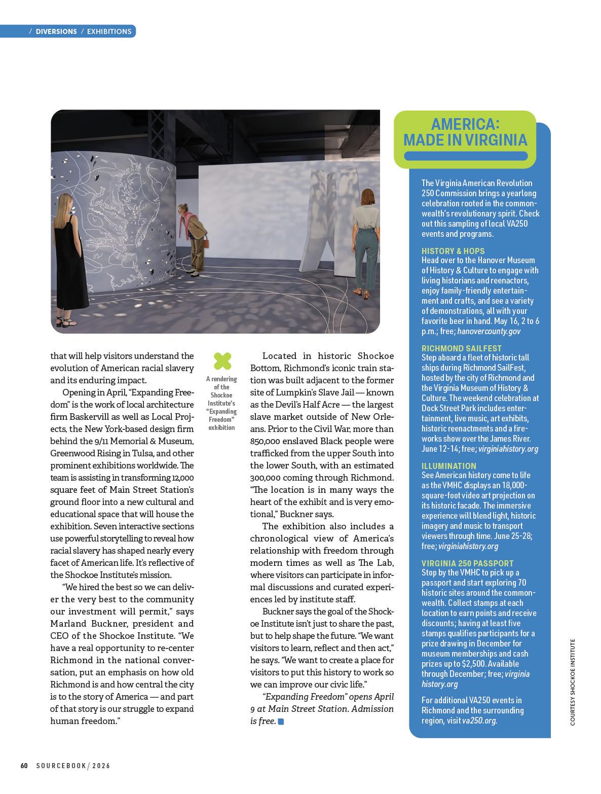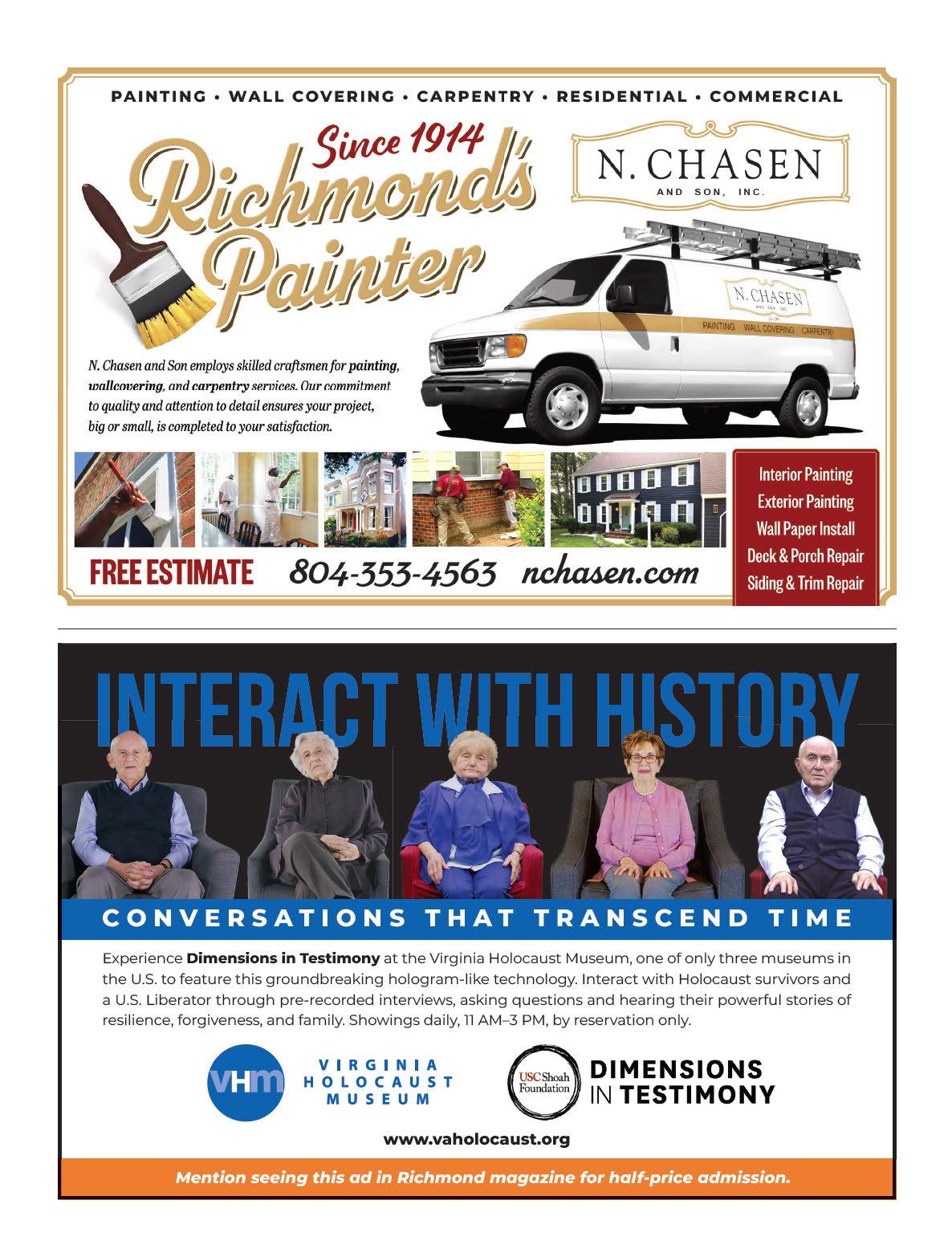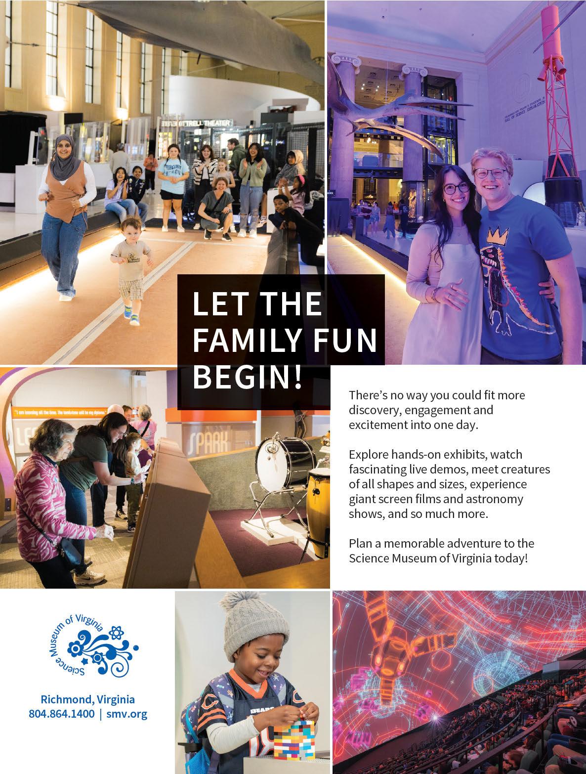 Connects visitors to America’s past through the story of Virginia. After a $30 million renovation in 2022, the museum o ers additional galleries, a refurbished research library and more. 10 a.m. to 5 p.m. 428 N. Arthur Ashe Blvd., 804-340-1800; virginiahistory.org